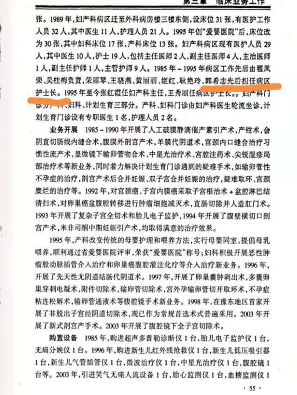 而昨天一位网友给我发来两张照片,说这是淮河医院院志上的图片和资料,资料上说郭希志在1995年之前担任过护士长,至于是哪一年到1995年担任护士长则不得而知,同时照片上显示,婴儿出生后的宝贝是不一样的,这也和许敏的质疑比较吻合,同时也是河南大学淮河医院在情况说明中没有说清楚的,淮河医院和许敏究竟谁在说谎?还是谁记错了?