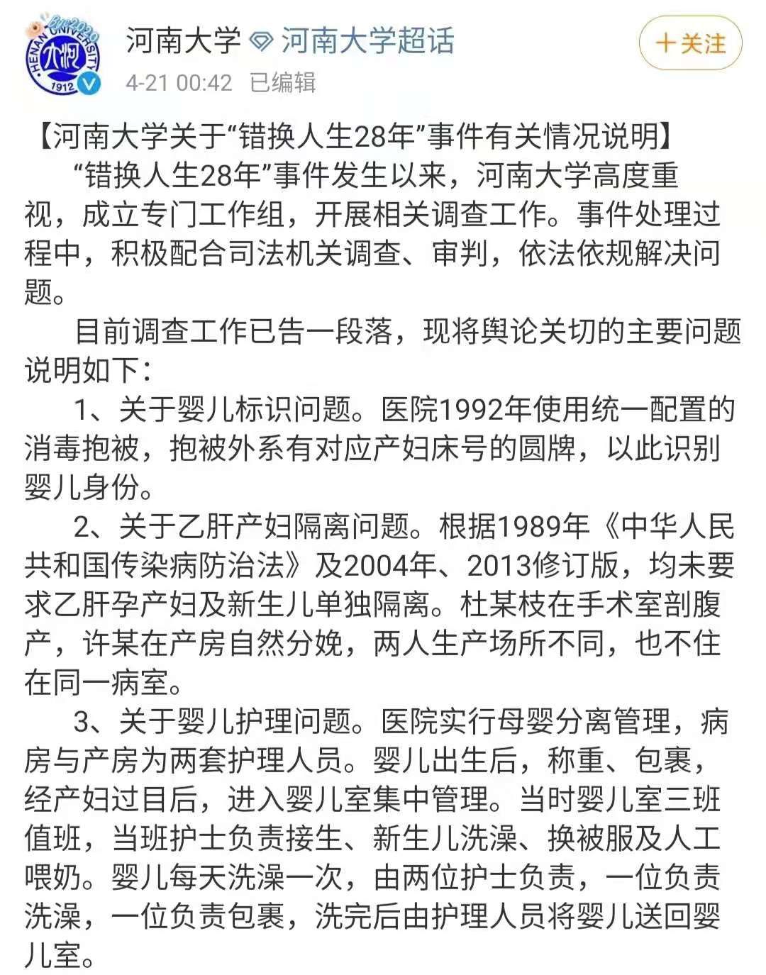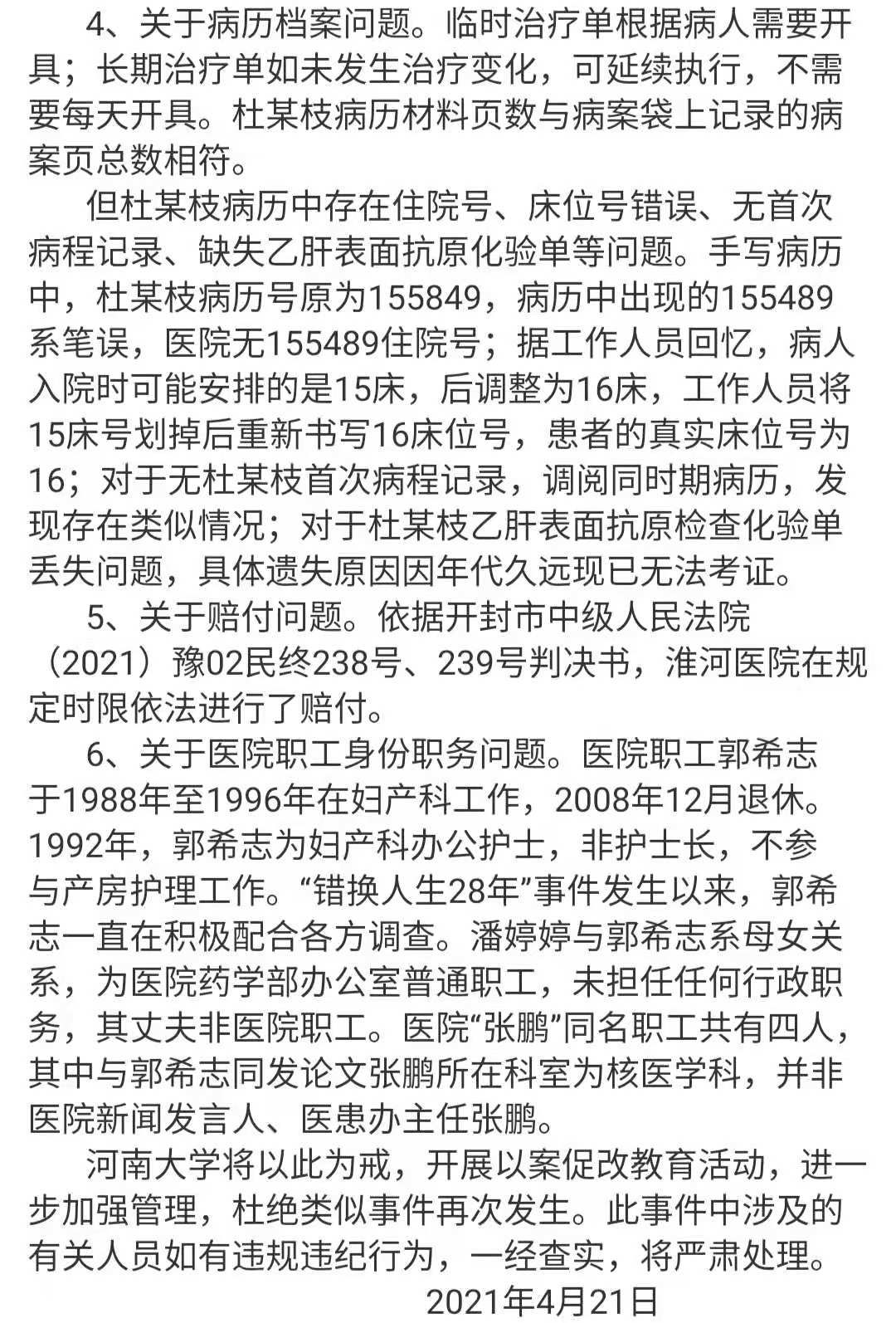 其中河南大学淮河医院在情况说明中提到:1、关于婴儿标识问题。医院1992年使用统一配置的消毒抱被,抱被外系有对应产妇床号的圆牌,以此识别婴儿身份。6、关于医院职工身份职务问题。医院职工郭希志于1988年至1996年在妇产科工作,2008年12月退休。1992年,郭希志为妇产科办公护士,非护士长,不参与产房护理工作。