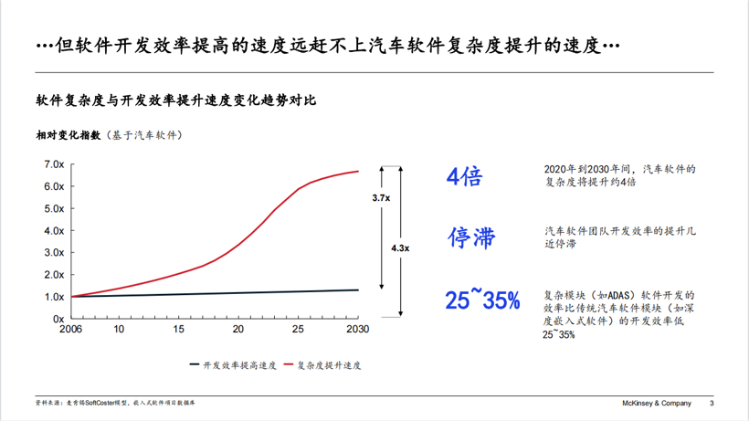 我们可以看到从今天到2030年,整个软件复杂度可能还要翻四倍。在这个情况下我们看一看车企软件开发效率,这根线是比较平的,处于相对停滞的状态。这里还要强调一个点是软件会分为不同类型,车企在开发软件时,特别是涉及到域级别和系统级别的软件,它的开发效率比深度嵌入等相对传统软件的开发效率还要低25-35%。在这个情况下软件需求和自己团队的能力,这个空间怎么弥补起来?