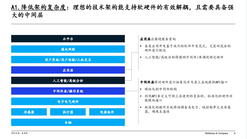 今天时间有限,我会针对某些点跟大家分享一下。首先是我们在管理汽车复杂度的维度,刚才讲到很多大家能够想到的,我的软件分层和平台化管理。这个概念已经不是很新了,包括应用层专注在软件开发,其实底层硬件应该跟它脱离,没有太多的瓜葛。人工智能、高级分析更多的是所有特定硬件调用逻辑关系非常清楚,这个基础是你有强大的中间层,包括中间层对硬件的抽象管控,也包括操作系统能在不同域之间的有效沟通。这个逻辑非常清楚,但我至少个人跟所有主机厂合作下来的感觉是大家想往那个方向走,但在真正的研发过程中,绝大多数企业还是被硬件牵扯鼻子走,每台车型出来要这个那个软件需求,下面底层控制器、硬件全部都是非常多元化,这就导致所有要做平台化规划和设计的过程节奏、预算完全没有办法落地。这个逻辑很清楚,但在实操过程中非常困难。