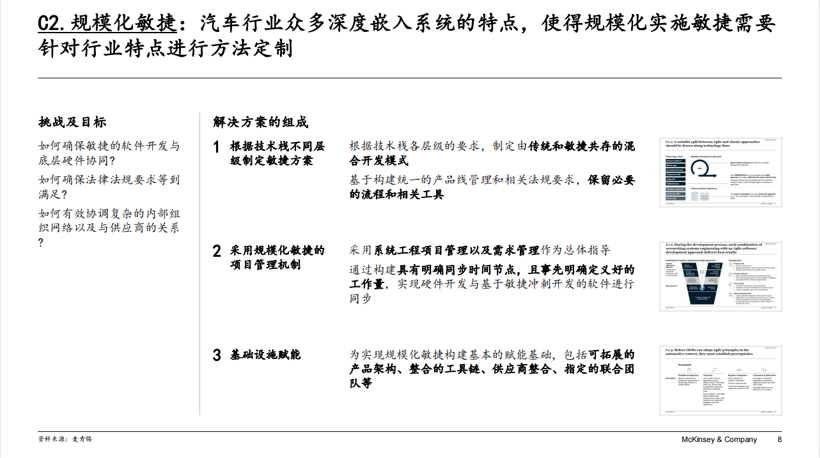刚才提到就算自己内部要做的时候,软件都想往敏捷迭代的方向走。但这里汽车的软件跟其它行业还不一样,因为它的敏捷迭代有很多特殊挑战。你毕竟是软硬件不能完全割离,其次汽车会涉及到安全,法律法规对你的敏捷迭代还有很多的限制。最后是说迭代不仅仅是内部自己的敏捷迭代,它跟供应商原来的合作模式怎么调整和处理。这里有几个我们可以思考的点: