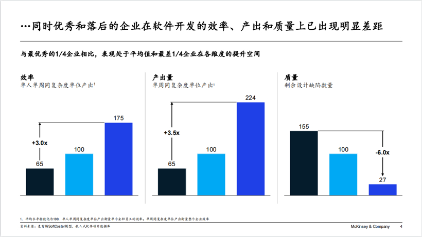 在这个基础上我们也看到不同企业状态完全不在同样的水平,这个图是我们基于15000个软件开发项目端到端的数据分析,很多项目是麦肯锡在背后跟他们一同工作的。我们按所有项目的最后结果,把企业分成不同的类型,最差的25%,最好的25%。大家可以看到第一个是说单个全职软件工程师,在比较差的企业和比较好的企业,他的效率、单元产出差了三倍。中间部分从整个企业来看,当然包括全职工程师自己的效率,也包括利用供应商的规划和管理能力,这个差距会更大(3.5倍)。