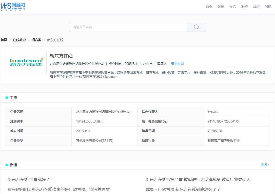 据网经社企业库(COP.100EC.CN)显示,新东方在线是新东方旗下专业的在线教育网站,课程涵盖出国考试、国内考试、职业教育、英语学习、多种语言、K12教育等6大类,2016年拆分独立发展,旗下有个性化学习平台“新东方在线网(koolearn.com)”、移动端少儿App“多纳”、视频直播教学平台“酷学网”、B2B业务品牌“新东方教育云”等。