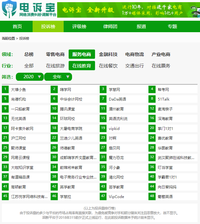 根据国内知名网络消费纠纷调解平台“电诉宝”受理的在线教育领域用户有效投诉显示(依据投诉量排行),“大塘小鱼”排名前三。