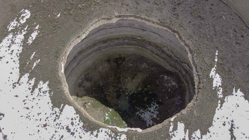 当地时间2021年4月13日,土耳其科尼亚,平原上的“天坑”。由于过度使用地下水灌溉,土耳其饱受干旱之苦的产粮区出现了好些足以吞噬汽车的地陷,农民担心它们的数量会不断增加,并逐渐向居民区靠近。