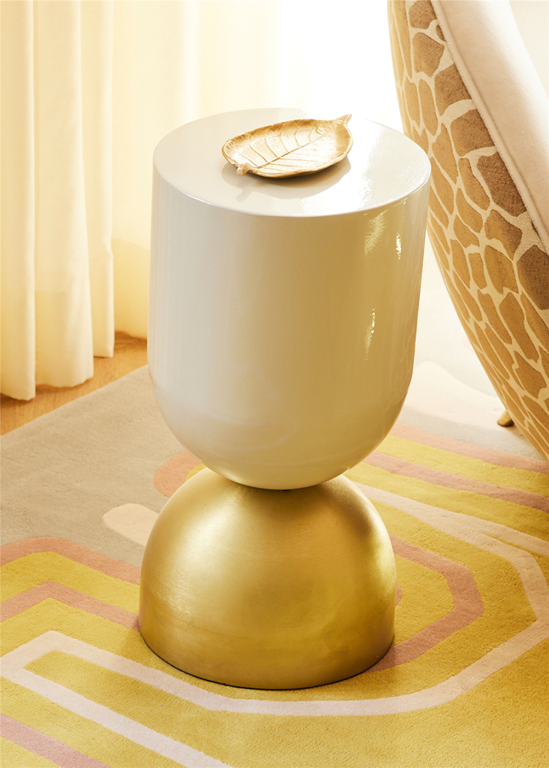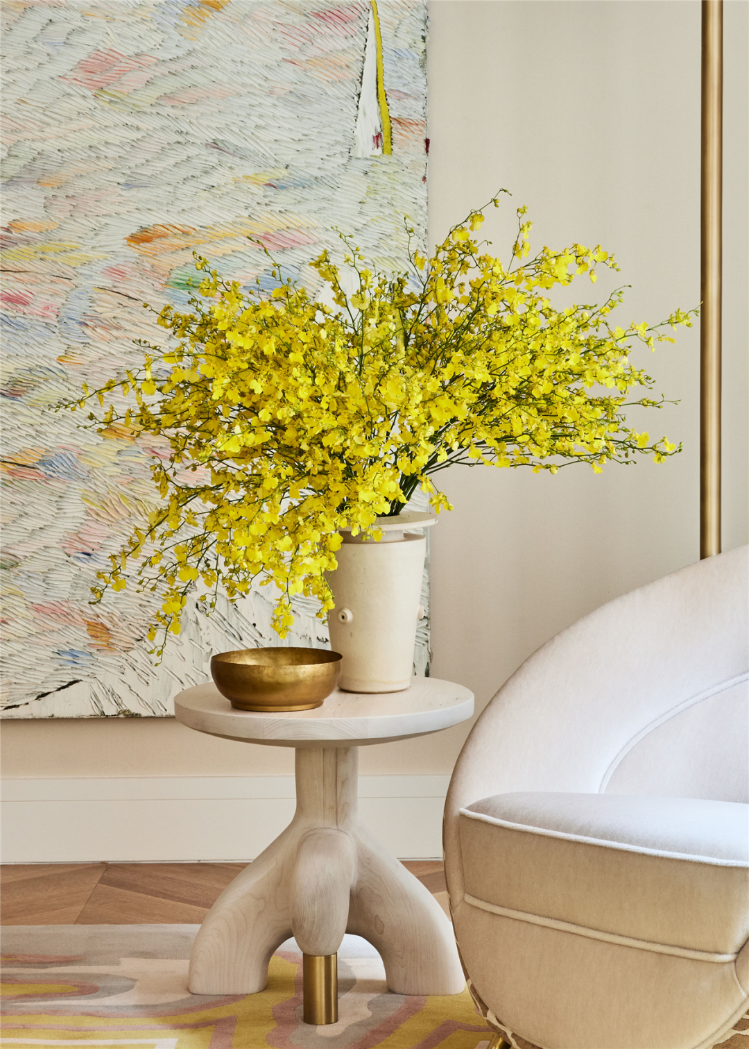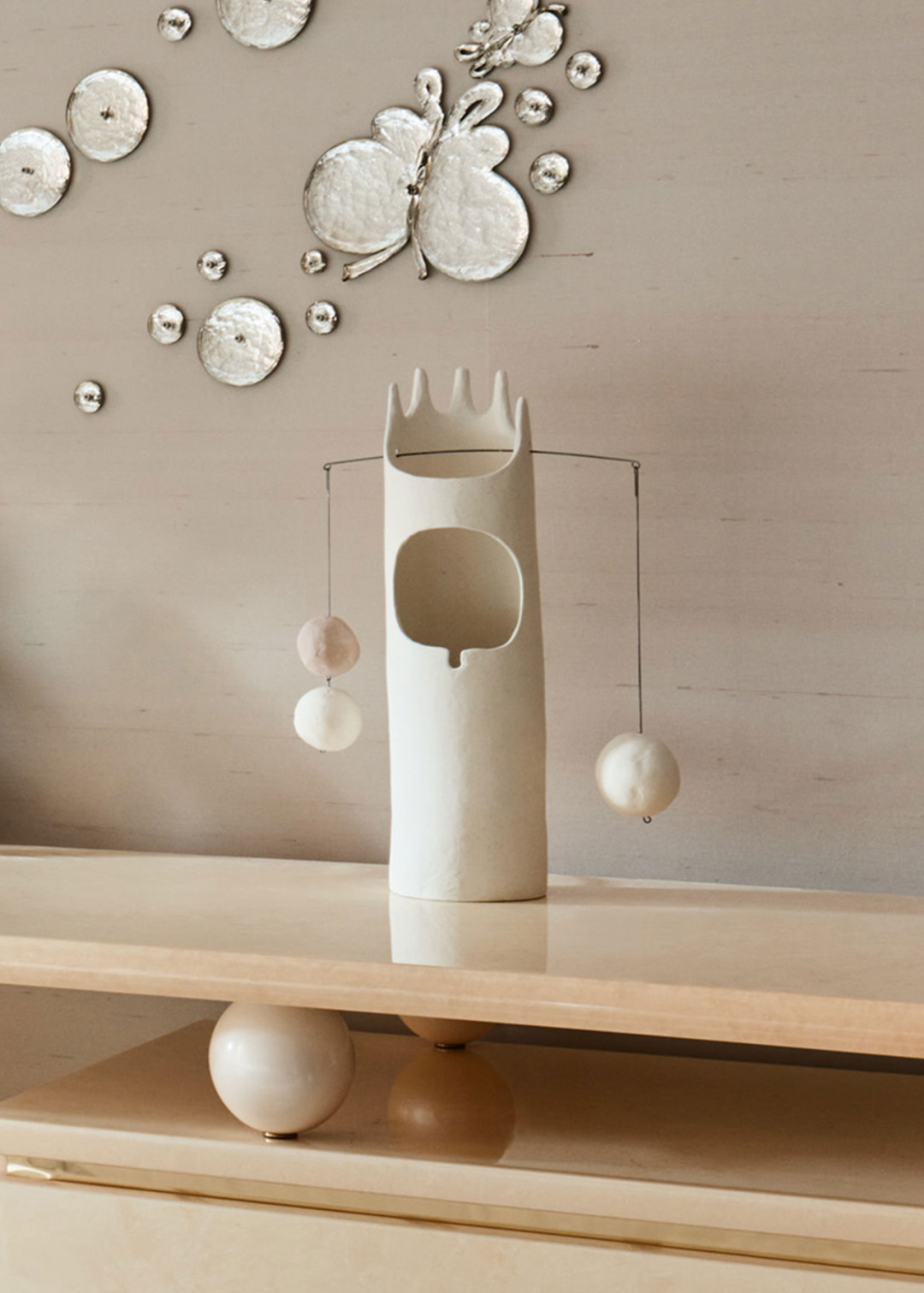 由四根金色柱子撑起的边桌是 Jean de Merry 设计的 Lyall Console,台面左侧摆放法国画家安德烈(Andrée)和米歇尔·赫尔莱特(Michel Hirlet)于2000 年在巴黎创作的两件式陶瓷花器,极具雕塑感。