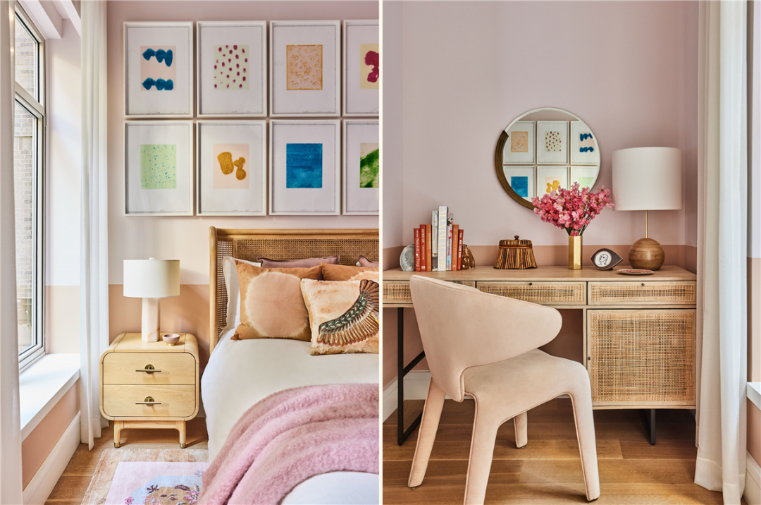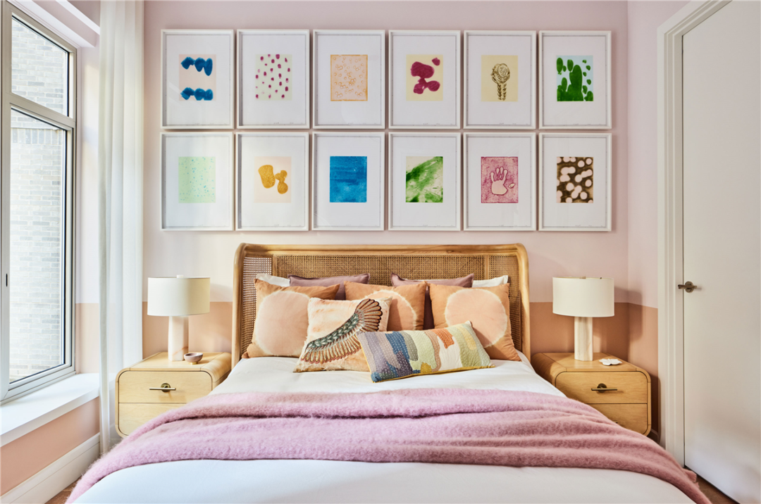 次卧是最能体现创造性的色彩运用,色调鲜艳的艺术品、柔和的灯具和木质元素,丰富了空间肌理。Thomas Schutte 的彩色蚀刻创造了富有冲击力的个性背景墙,同时也不会掩盖床头背板优雅的曲线。