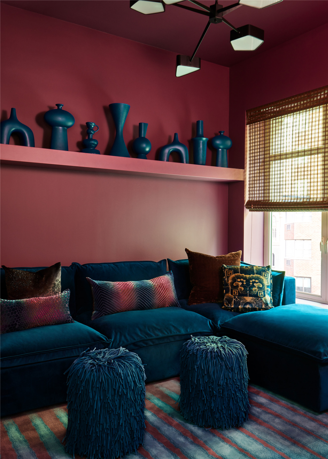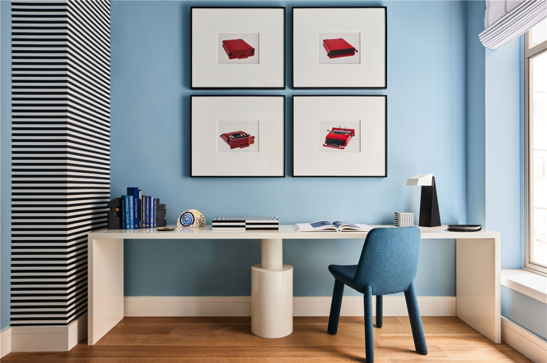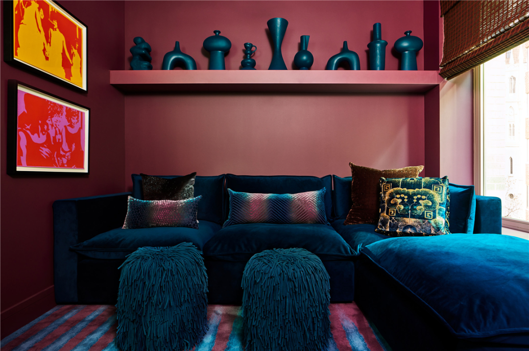 这间书房兼媒体室采用了高饱和的色彩,并融合了现代家具和艺术品。用统一的色调制作成各种尺寸和形状的花瓶,摆在置物架上,创造丰富的画廊体验。