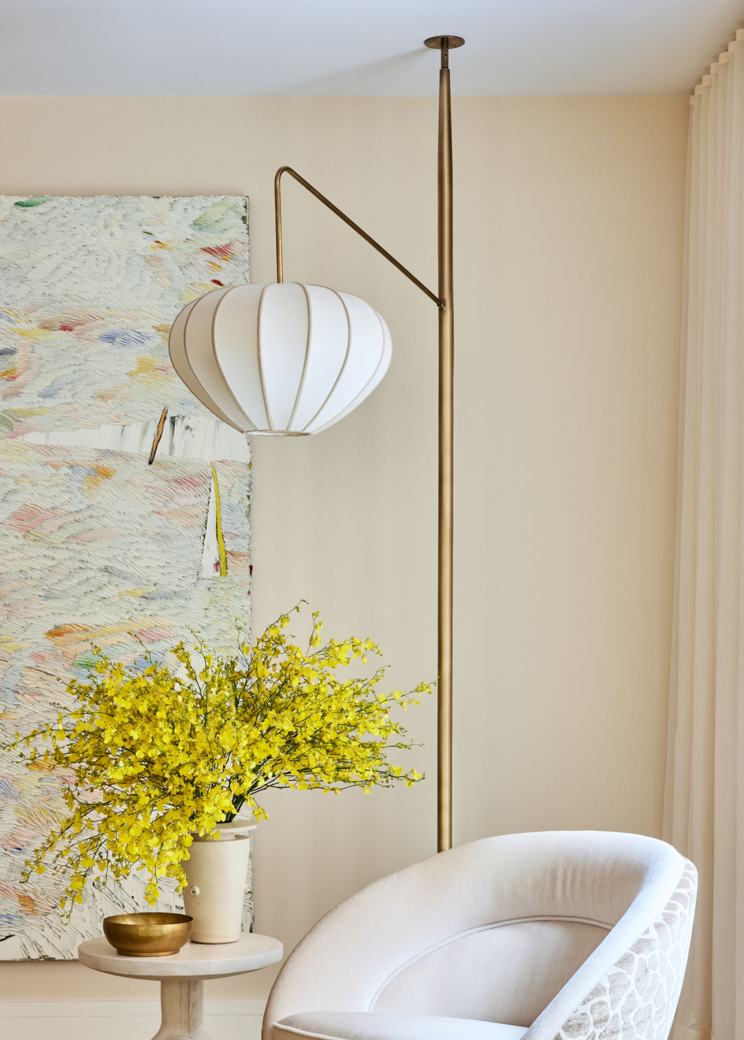 这款落地灯采用实心黄铜制成,出自 Kelly Behun 之手,以手工制成的丝绒和天鹅绒镶边做修饰,巧妙地地定义了角落空间。