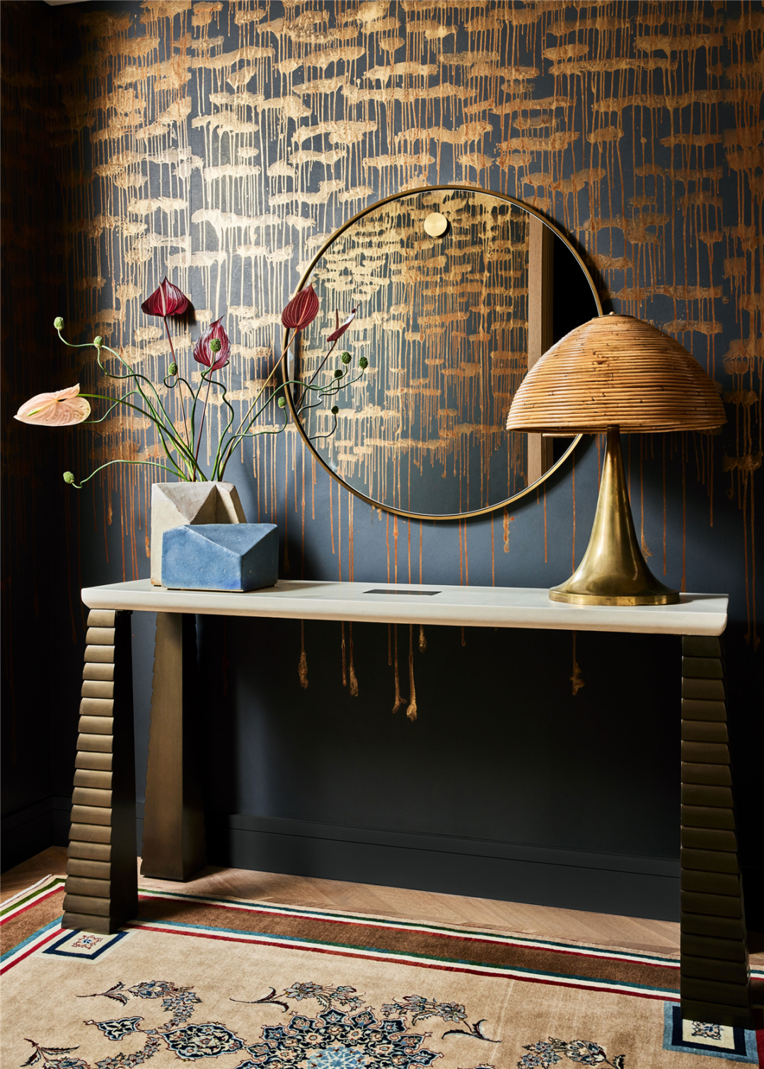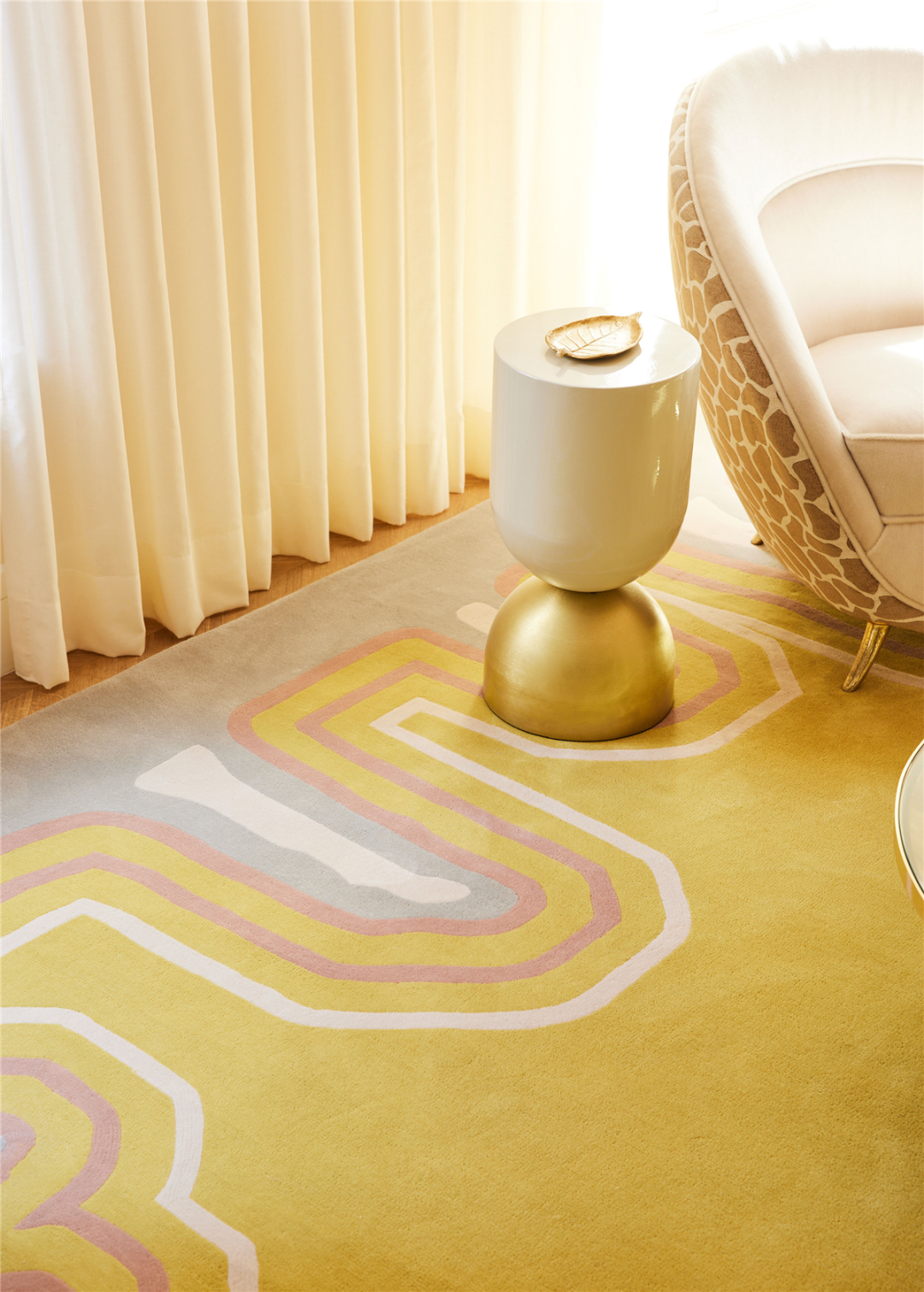 铺满半个房间的几何地毯也是 Behun 为 The Rug Company 特别设计的,是当代经典元素的即兴演绎。