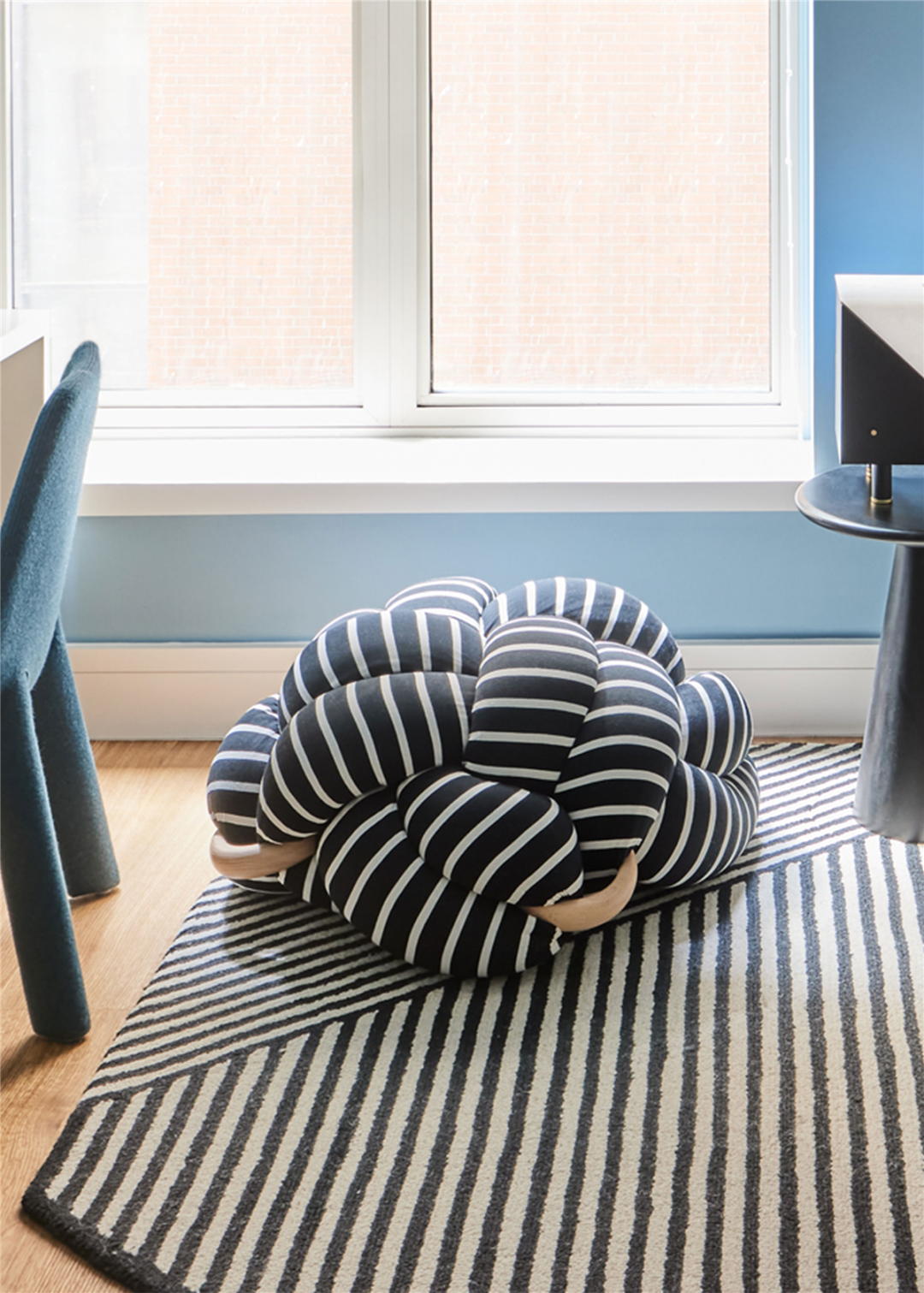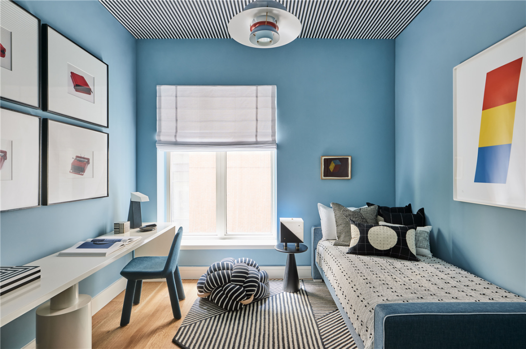 儿童房用醒目的黑白蓝图案和俏皮的家具构筑了一个活力且精致的空间。Knots Studio 的结式坐垫、Kelly Behun 设计的黑白方灯、以及Anthropologie 的条纹地毯,这些组合可以在任何生活空间中添加额外的线条和质感。