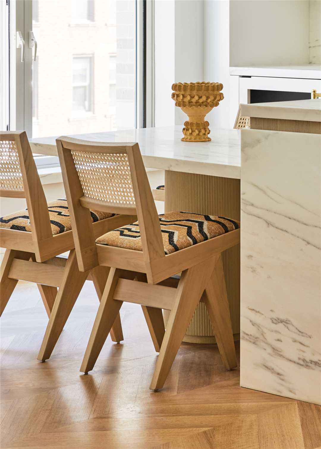 白橡木地板和木制 Jeanneret 餐椅搭配,营造温润肌理感。