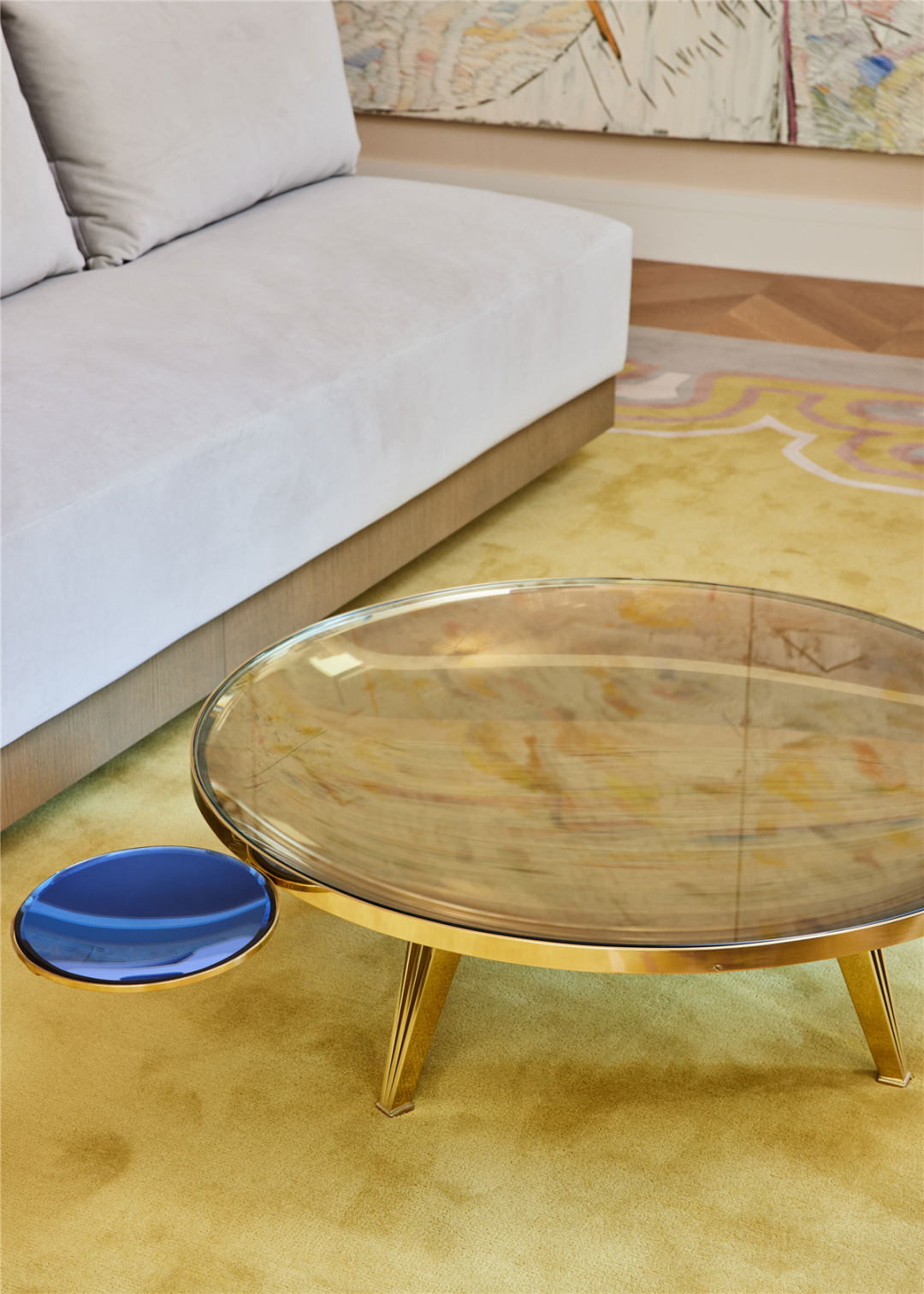 这张 Riflesso 咖啡桌是艺术家 Gasparo Asaro 手工制作的,双层玻璃的厚度,使作品具有独特的深度感。