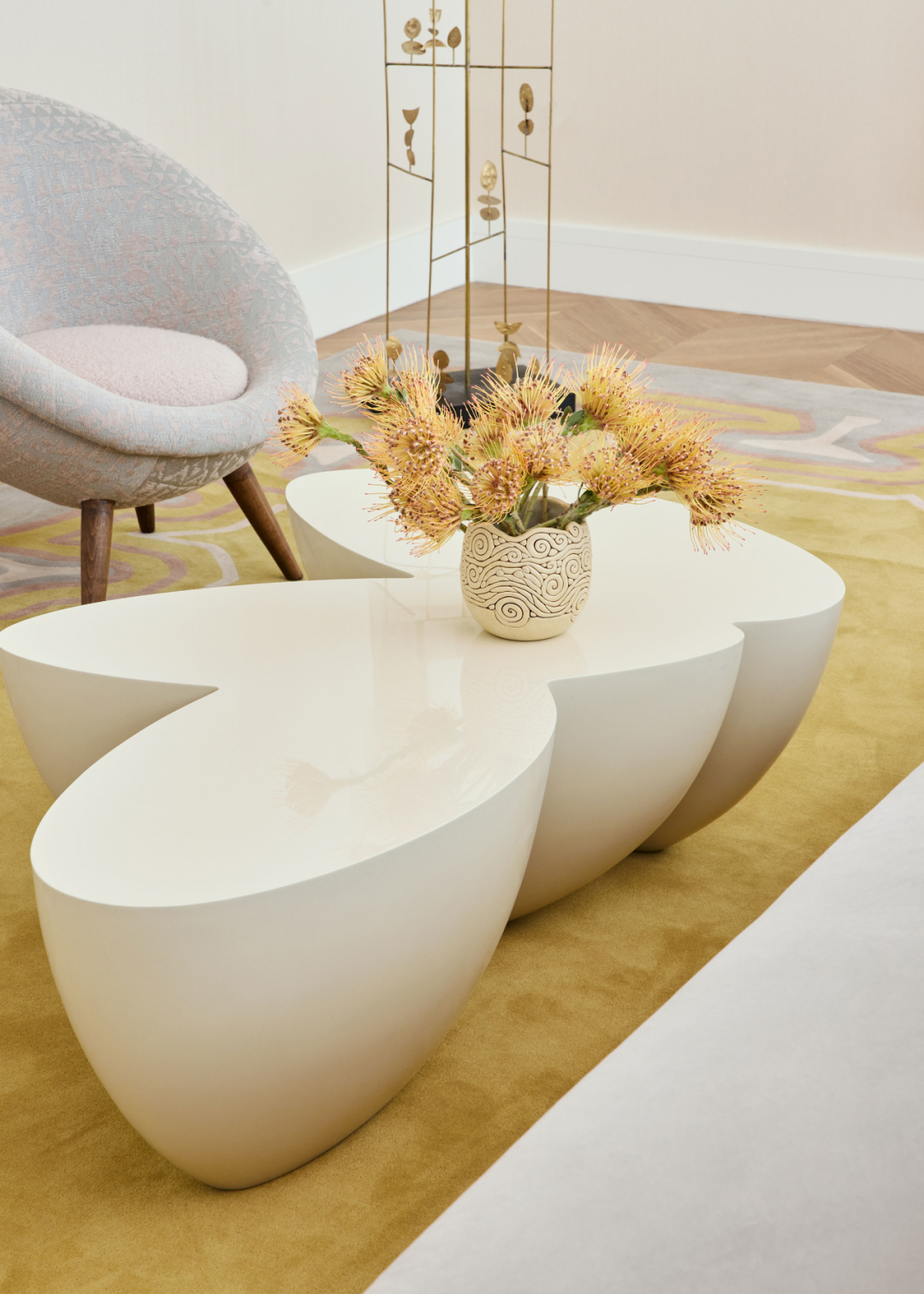 最最吸睛的是这张不规则的白色茶几,Sizzle 3 Pod table,是 Wendell Castle 最知名的设计之一。