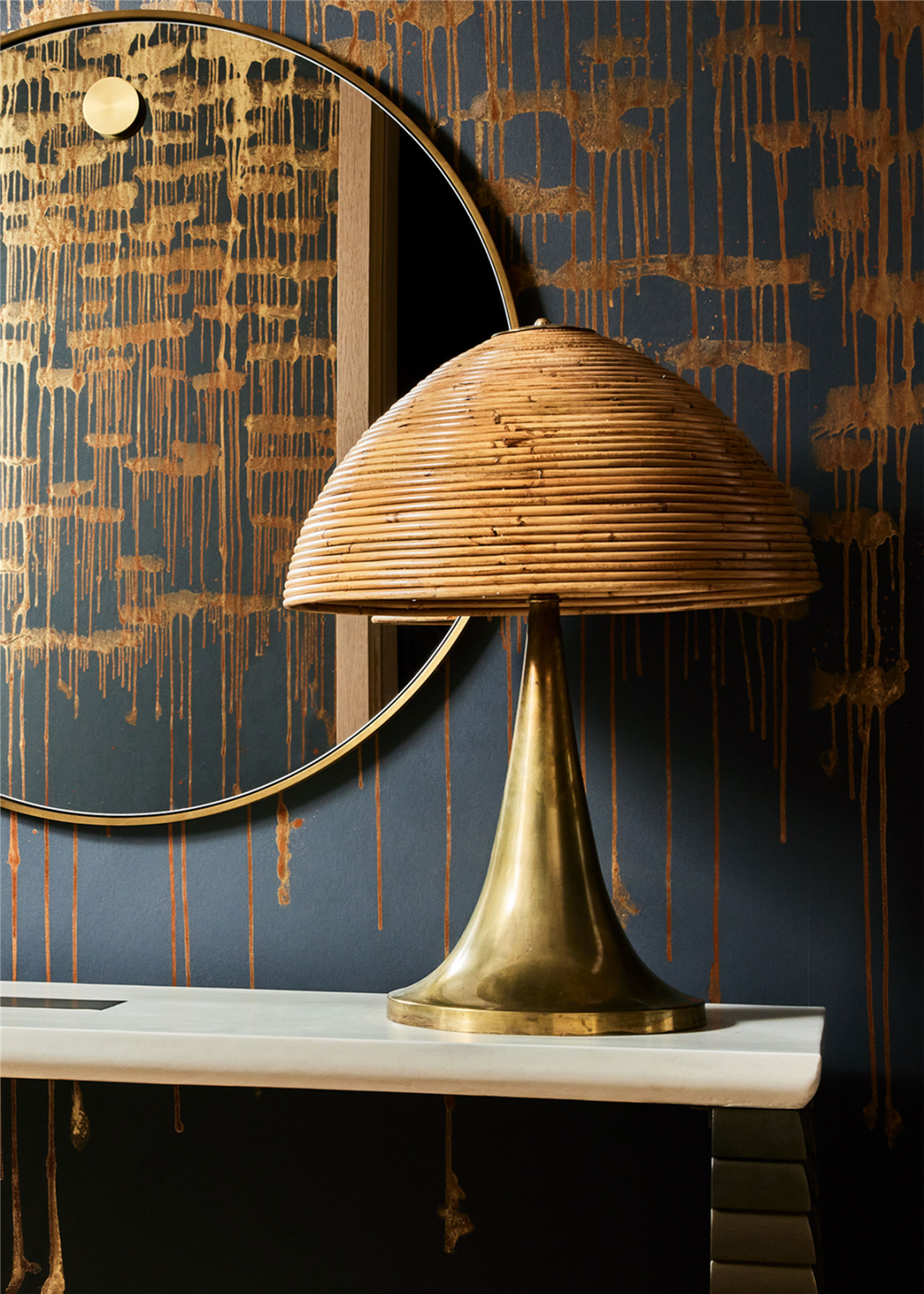 这是一盏古董台灯,纤细的黄铜底座和竹质灯罩搭配,掩饰不住的奢华气息。背面挂着 Regina Andrew 设计的黄铜圆镜。