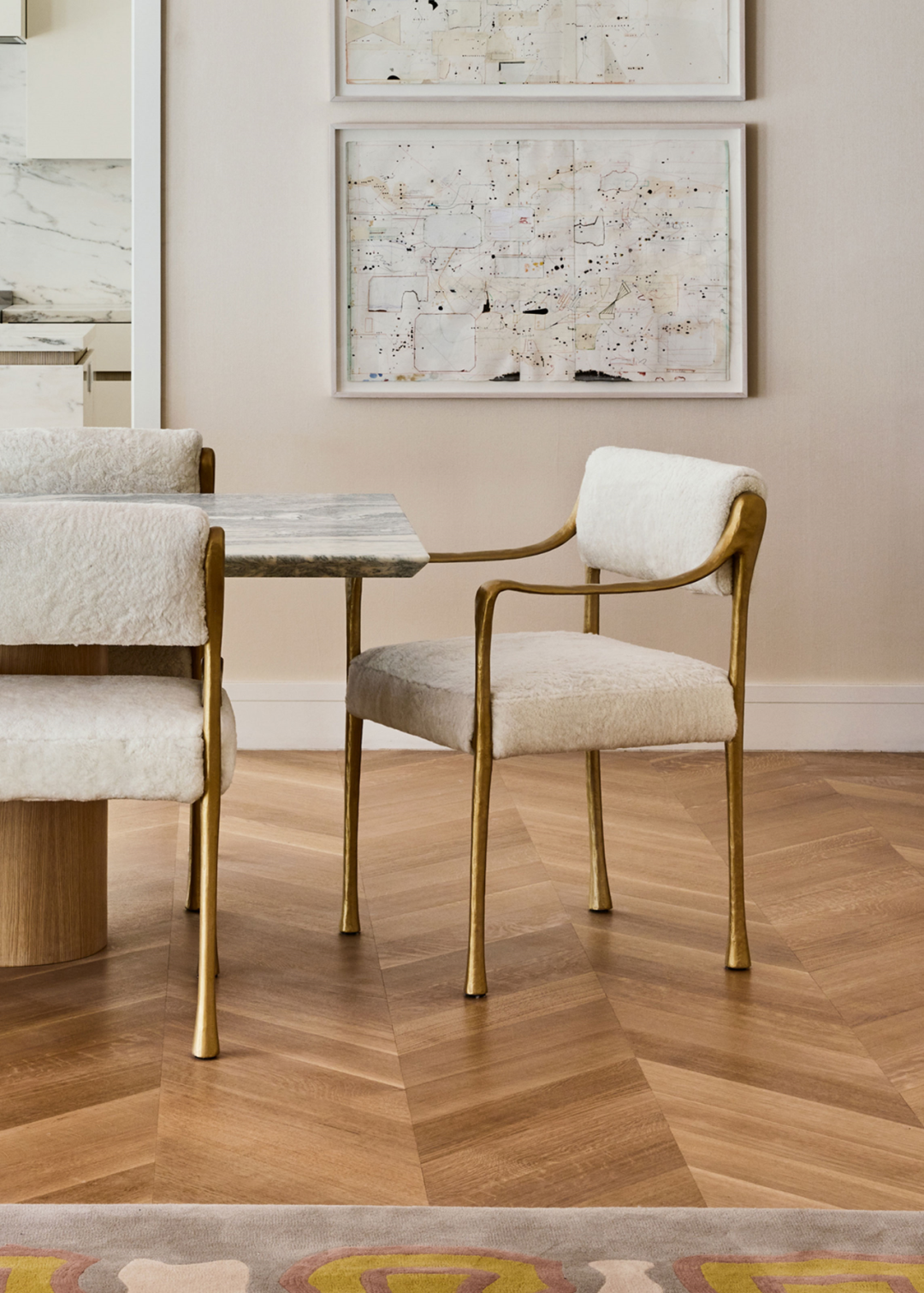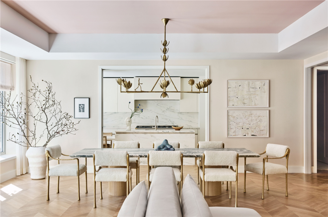 大理石餐桌周围摆放着 Giacetti 设计的餐椅,弯曲的黄铜扶手被柔软织物包裹。