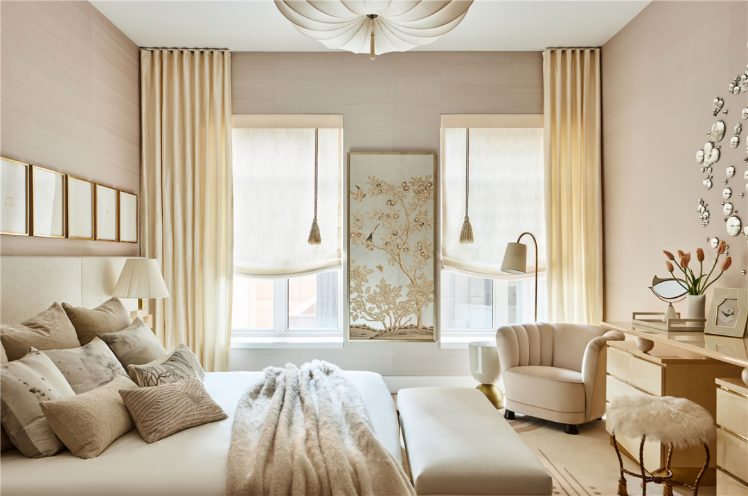 接下来进入私密的卧室区,首先是主人套房,通过柔和的质感、光线和大气的艺术品来营造一种沉稳的睡眠氛围。