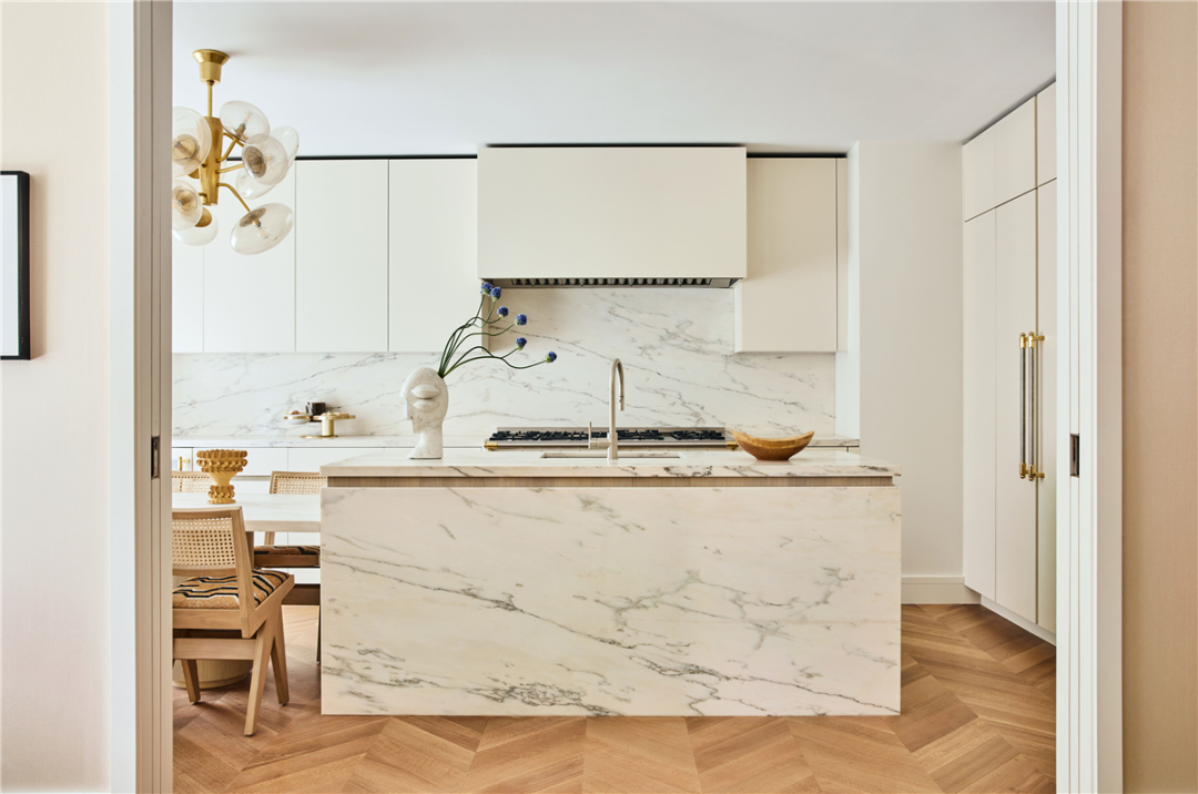 采光良好的厨房设计得豪华而实用,配有定制的哑光橱柜、优雅的大理石中岛和超大窗户。