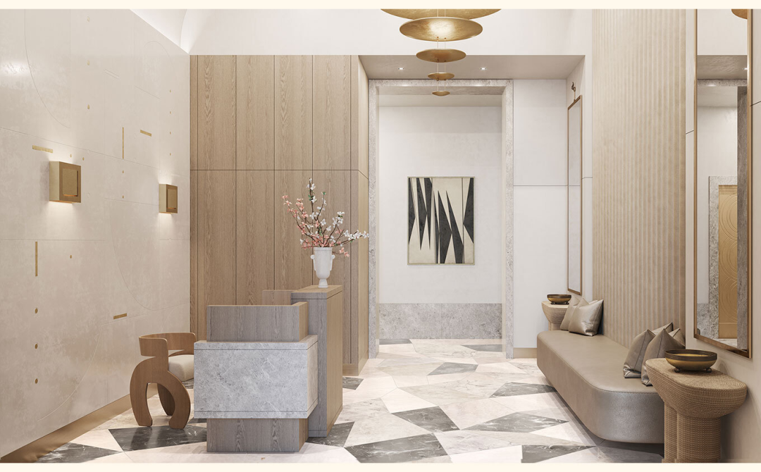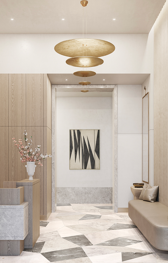 公寓的入户大厅的配色也以柔大气为主,石材拼成的地板与金属灯具的质感相辉映,大地色的墙面与内饰共同营造温暖细致,又不失大气经典的氛围。