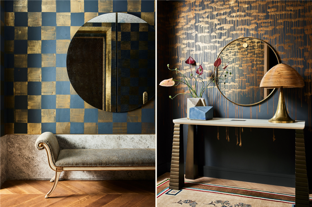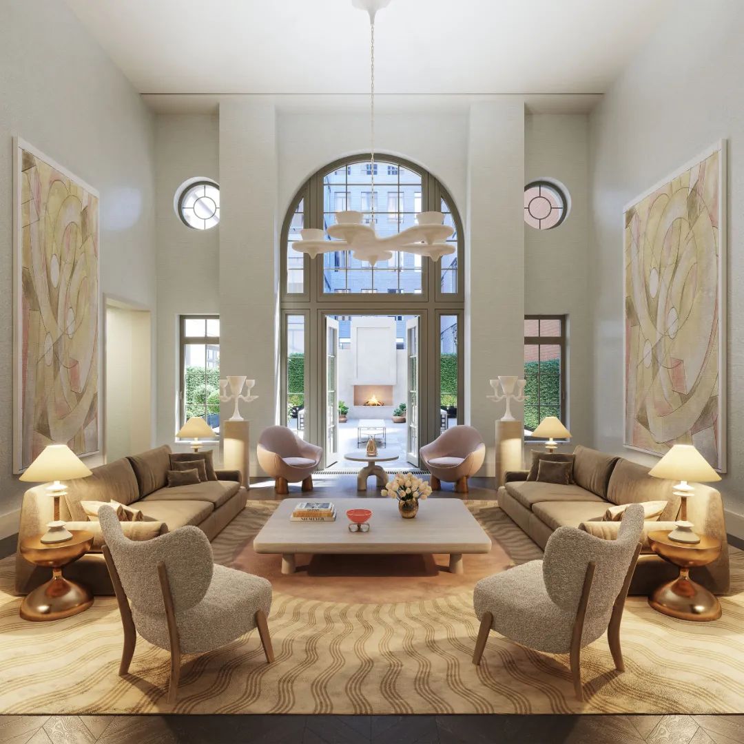 Living Gallery 空间中的每个细节都经过精心设计,营造一种既时尚又舒适的环境。入口门厅用大胆的金色定下了热情的基调,笔触丰富的墙面材料是 Callidus Guild 特别设计的一套壁纸。