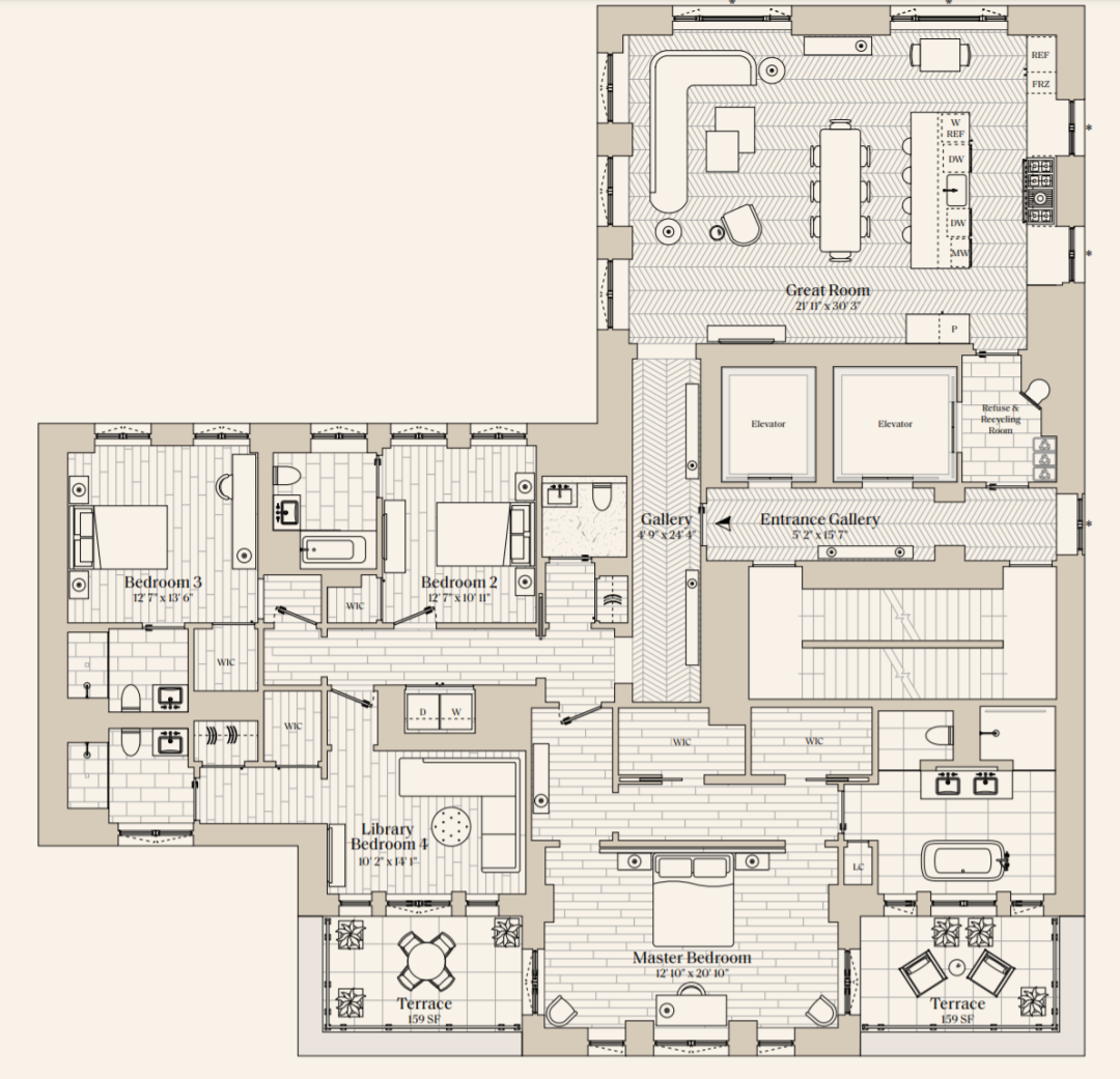 这套公寓带独立电梯玄关,以及 4 房 4 卫的人性化布局。
