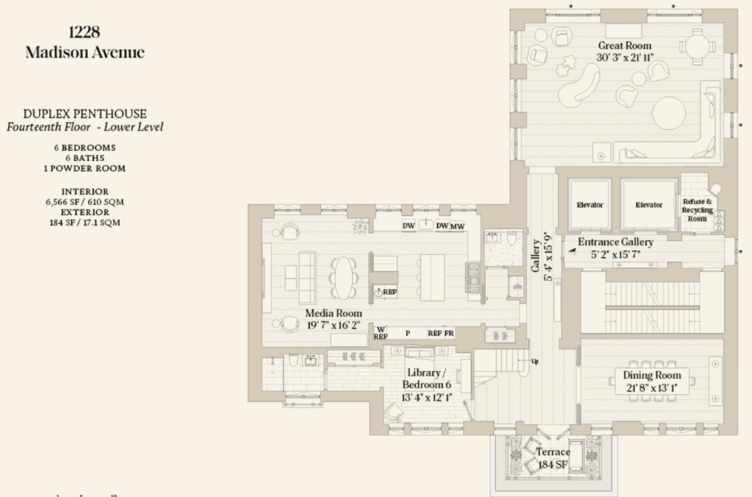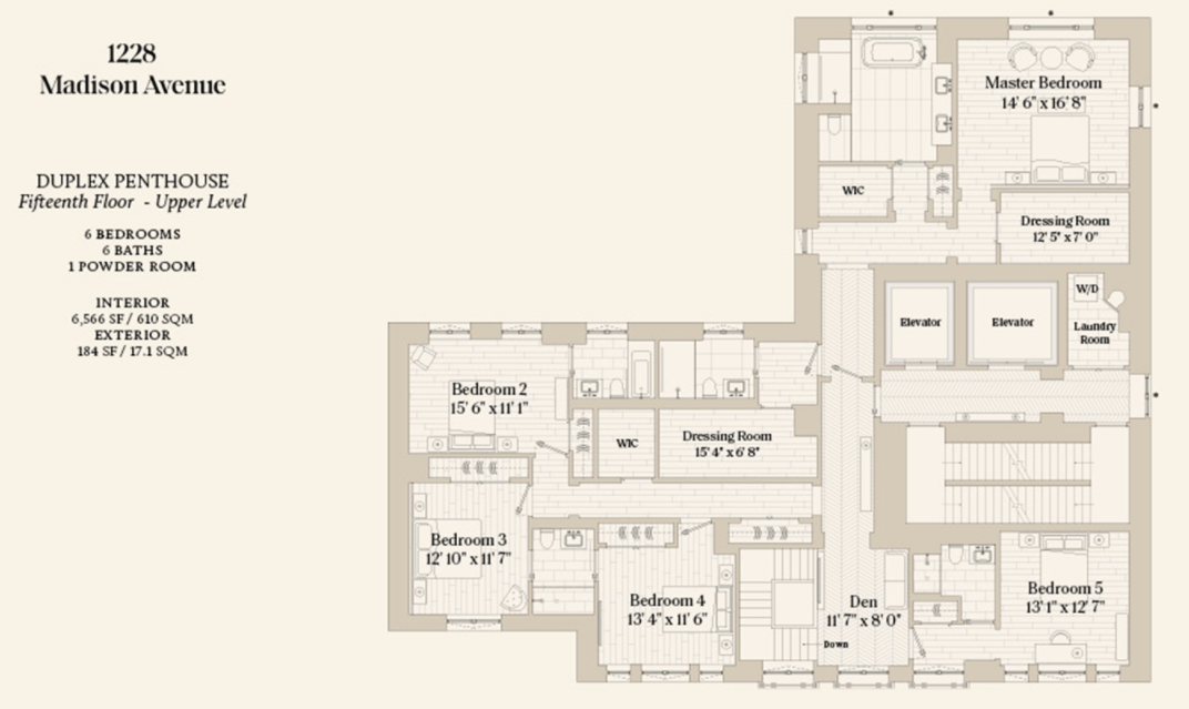 6房6卫的两层高复式 DUPLEX PH,面积 610㎡,售价 21,600,000 美元(约合人民币 1.4亿) ▽