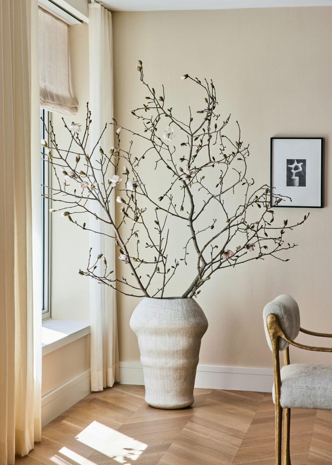 角落里的插花与枝形吊灯形成呼应,充满无限的自然气息。芬兰艺术家 Kristina Riska 的花器作品“ Theba II”,具有起伏的曲线和有机形态,烘托植物元素的宁静致远。