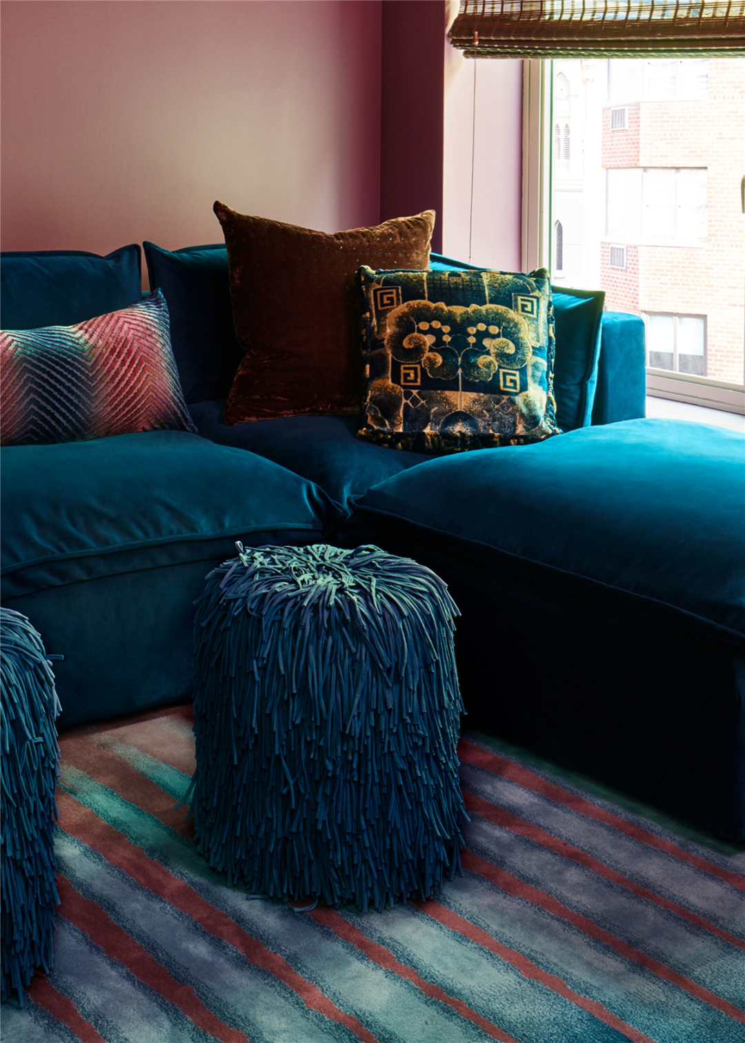 Gucci 的天鹅绒靠垫、Kevin O'Brien Studio 的人字纹抱枕,组合成精致奢华的家居空间。
