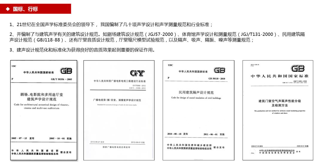 第一层次(基本):防范建筑设计中可能出现的潜在声学问题。住宅、学校、旅馆、医院、办公建筑、商业建筑等的隔声降噪。报告厅、体育馆、多功能厅、会议室等的语言清晰度问题。工业场所噪声的劳动保护和环境保护问题。音乐厅、剧场、剧院、演播室、录音室等专业音质问题。