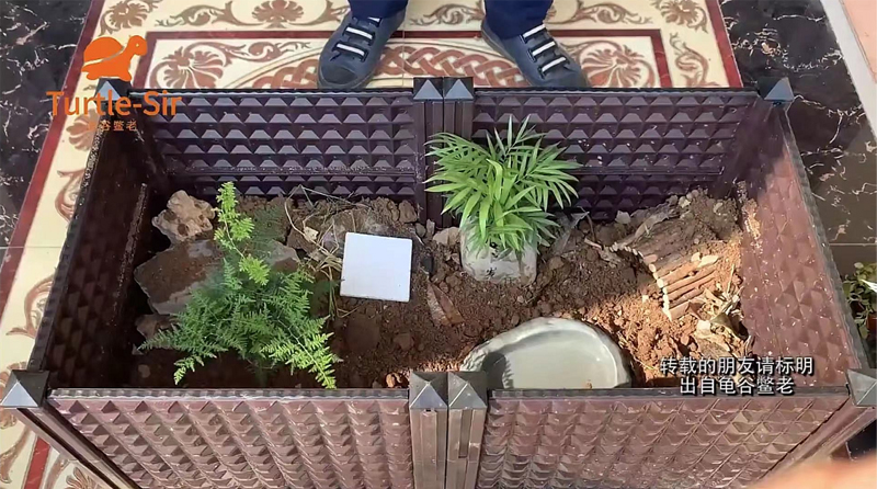 活动区域也就是植物种植区域需要保持一定的干燥不要太潮湿以防止细菌滋生,因此活动区域的土壤选择建议可以选用普通黄土或者红土,土壤特性以干硬板结为块最为适宜。这个区域从设计上讲可以用松皮石做一些假山,也可以用苔藓、青草铺出一些丘陵、小山坡或者斜坡,一方面是增加全生态饲养空间的美感,另一个方面可以增加黄缘闭壳龟的运动量和活动强度,让黄缘闭壳龟更健康,但是也提醒一下这个区域要注意不要造成积水哟。