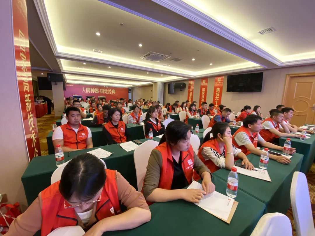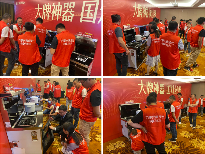 在茶歇时间,经销商们对会议现场摆放的多台爆款万事兴集成灶充满兴趣,纷纷驻足观赏询问工作人员细节。