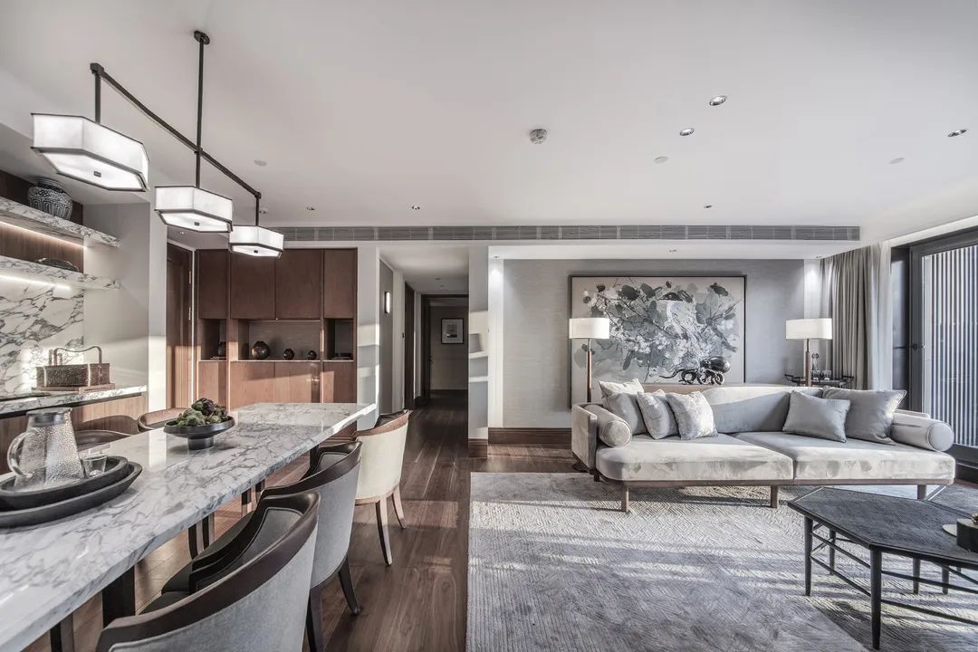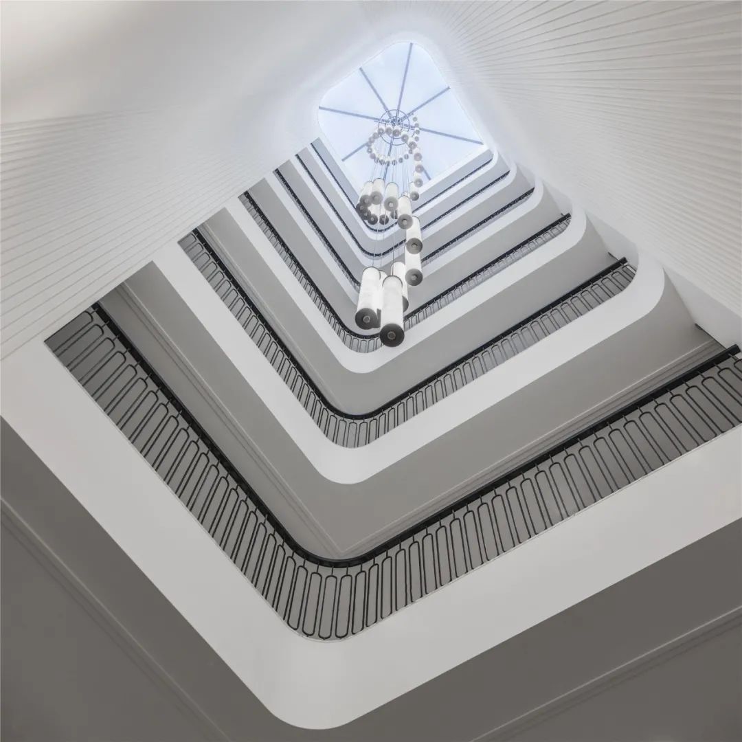 搭配上方近20米的长吊灯,不仅提升空间的质感,更是将洋房韵味与现代空间美学的结合展现到了极致。