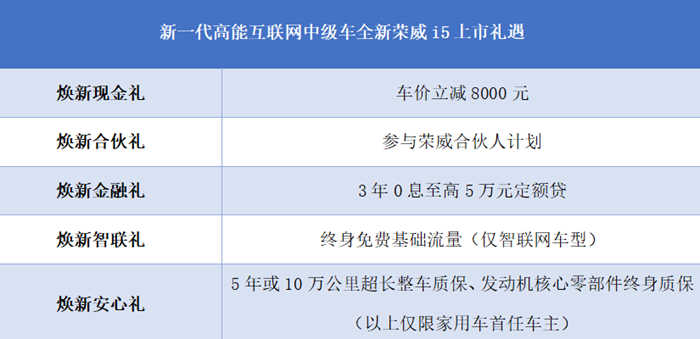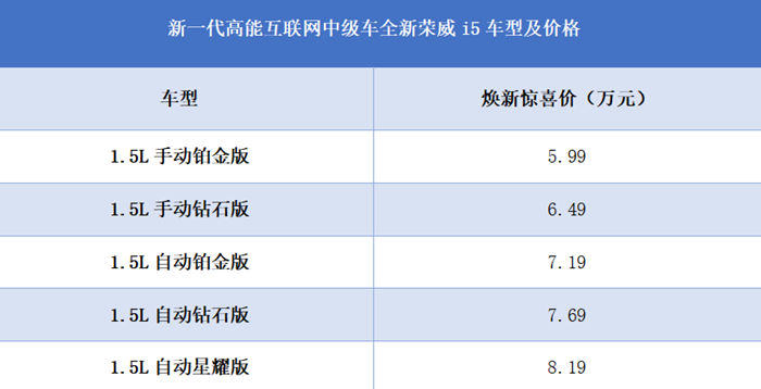 上汽荣威新一代高能互联网中级车——全新荣威i5劲爆上市,为Z世代实现“购车梦”实力撑腰。全系共推出5款1.5L车型,官方指导价6.79-8.99万元。新车不仅在价格上诚意十足,更送上焕新现金礼、焕新合伙礼、焕新金融礼、焕新智联礼、焕新安心礼5大惊喜豪礼,焕新惊喜价5.99-8.19万元,预售开启一周就斩获超5000个订单。