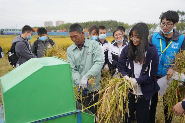 学生在海纳生态园学习如何收割水稻