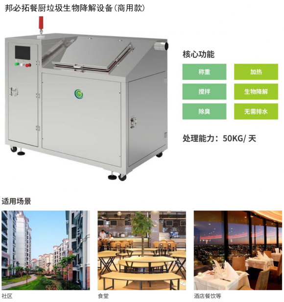基于该菌种技术,邦必拓目前已推出餐厨垃圾生物降解设备,该系列设备日均处理能力可达2.5kg(家用)、20kg、50kg、100kg、1吨、5吨等甚至更多,适用于家庭、餐厅、酒店、社区、单位食堂等场所。系列设备可实现餐厨垃圾就地处理,不仅突破了地域限制,免去了中间收运环节,还无二次运输污染风险,达到餐厨垃圾减量化、资源化、无害化处理的目的,解决目前餐厨行业以及家庭生活中餐厨垃圾造成的脏、乱、臭等难题。
