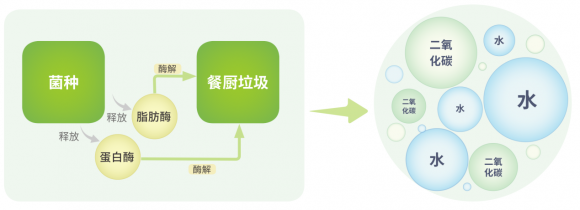 餐厨垃圾生化降解处理技术是邦必拓结合国内外最先进的菌种筛选和培养技术,选取自然界生命和繁殖能力强的高温复合微生物菌种,在一定温度下,通过菌种自身分泌高活性的蛋白酶及脂肪酶等酶系,释放到细胞外部,与餐厨垃圾接触后发生酶解作用,将其中的主要成分:果蔬纤维、蛋白质、脂肪等高分子物质逐步酶解成为低分子物质,低分子物质进一步分解为单体物质进入菌种体内,被菌种体内的三羧酸循环等代谢途径彻底分解为二氧化碳、水等物质。
