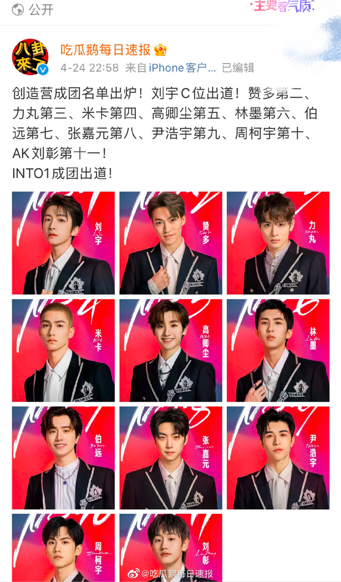 不知不觉创造101过去三年了,又是一个新的轮回,微博首页看到公布名次,刘宇获中心位,依次排名为刘宇,赞多,力丸,米卡,高卿尘,林墨,伯远,张嘉元,尹浩宇,周柯宇,刘彰。