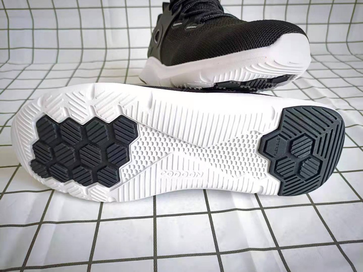 作为一款全生活场景通用的鞋子,鞋底耐磨防滑就显得尤其重要。咕咚采用了高密度的耐磨橡胶,在结构上通过动线的延伸把前后脚掌串联起来;前后脚掌分段式蜂巢纹路设计,让鞋子的抓地力和耐磨性进一步加强。如此设计,适应多种路况,比如:乡间小道、柏油马路、塑胶跑道、甚至雨后的泥泞泥巴路。