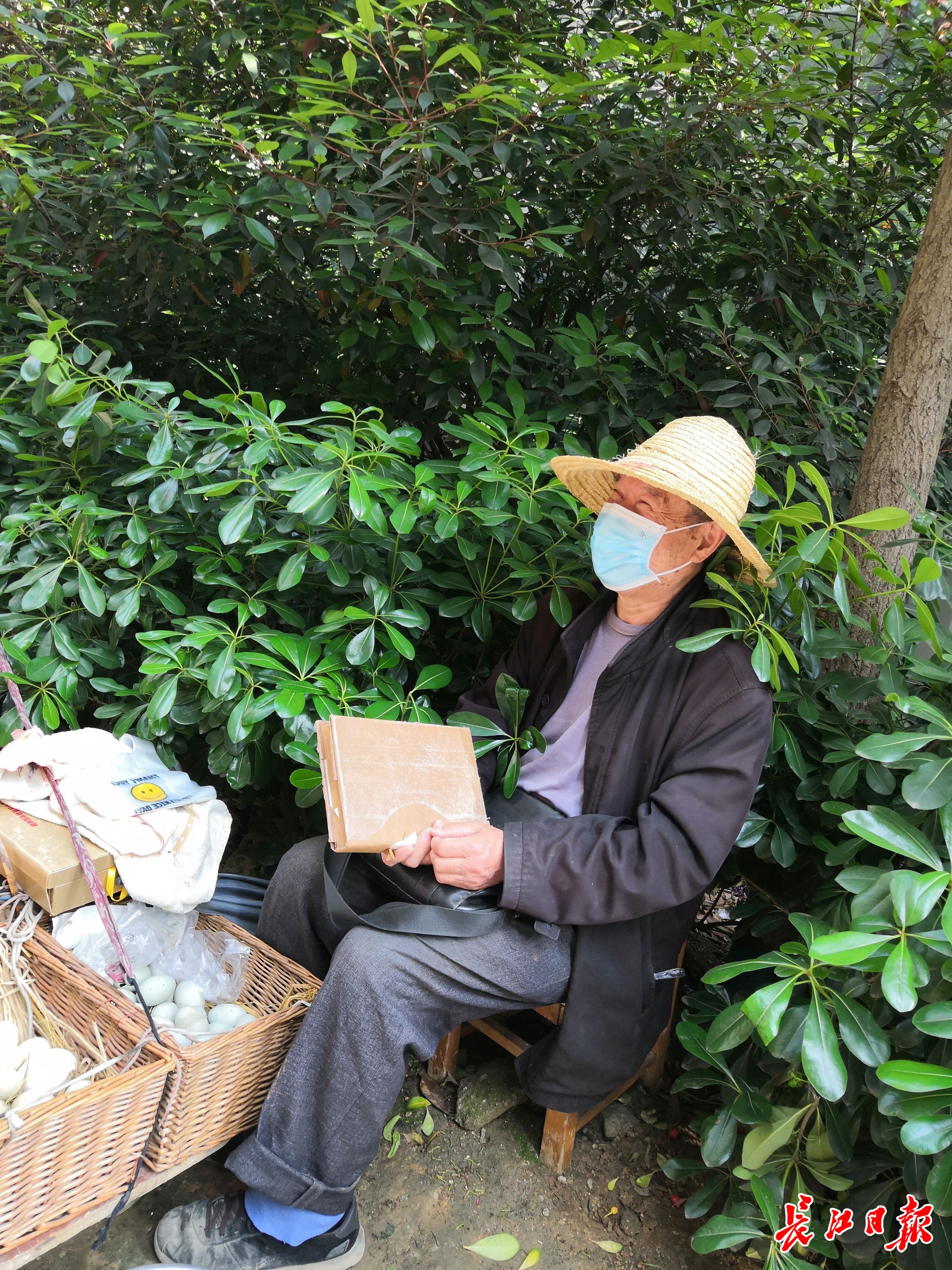 长江网讯(记者 张维纳)戴着草帽和口罩,一双旧布鞋沾满了泥巴,面前的拖车上摆着三筐鸡蛋,70多岁的大爷背靠着冬青树坐着。旁边卖青菜、卖水果、卖玉米的商贩都在招呼着客人,他的鸡蛋却无人问津。