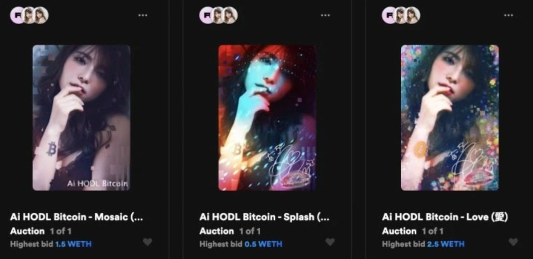 此前,上原亚衣就在 Rarible 上发布了一组名为“Ai HOLD Bitcoin”的图片 NFT 作品。区区几个滤镜就能换来最高40万的转售价,不经让人羡慕 韭菜们 粉丝们的财力。