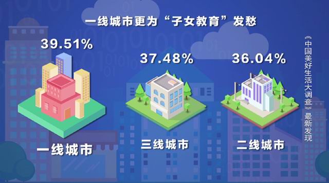从一、二、三线城市来看,一线城市的人们更为子女教育而发愁,二、三线城市也不相上下。