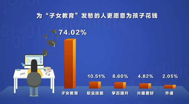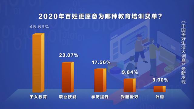 根据调查数据显示,在2021年有31.3%的受访者想在教育培训上增加消费,那么他们更愿意为哪种教育培训买单呢?调查数据显示,排在第一位的就是“子女教育”,占比45.63%,超过第二名“职业技能类培训”近一倍,家长舍得为孩子“痛下血本”已经成为一种常态。