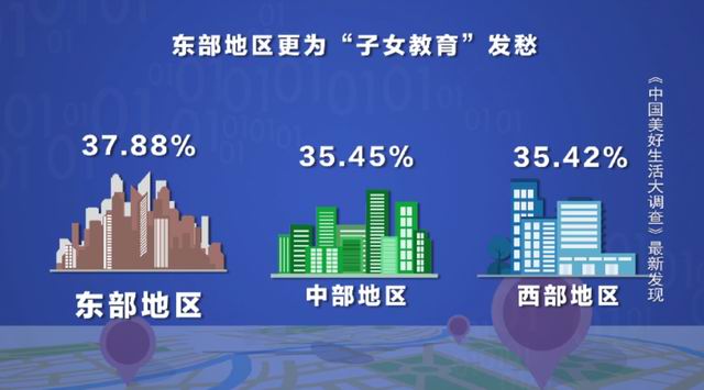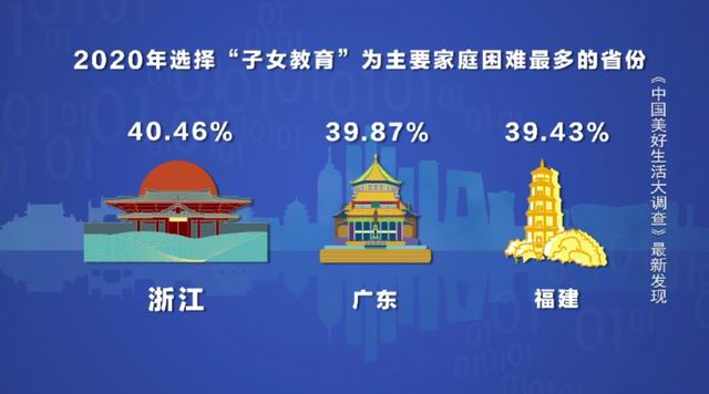 大调查数据显示,2020年,选择“子女教育”难题最多的省份是浙江、广东和福建。从四大区域来看,为“子女教育”而焦虑的家庭最多集中在东部地区,占比37.88%,其次是中部(35.45%)和西部地区(35.42%)。