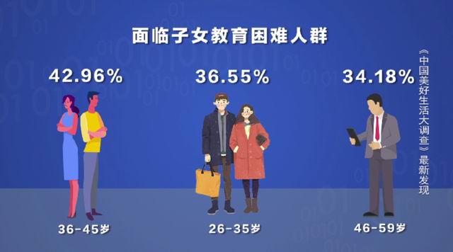 《中国美好生活大调查》每年发放10万张明信片问卷,覆盖全国 31个省市自治区、104个城市和300个县,每年调查10万户中国家庭生活感受、经济状况、消费投资预期、民生困难和幸福感等。这份调查客显示了子女教育”难题已经不仅仅是一个家庭的困难,而发展成为中国父母们普遍存在的集体焦虑。