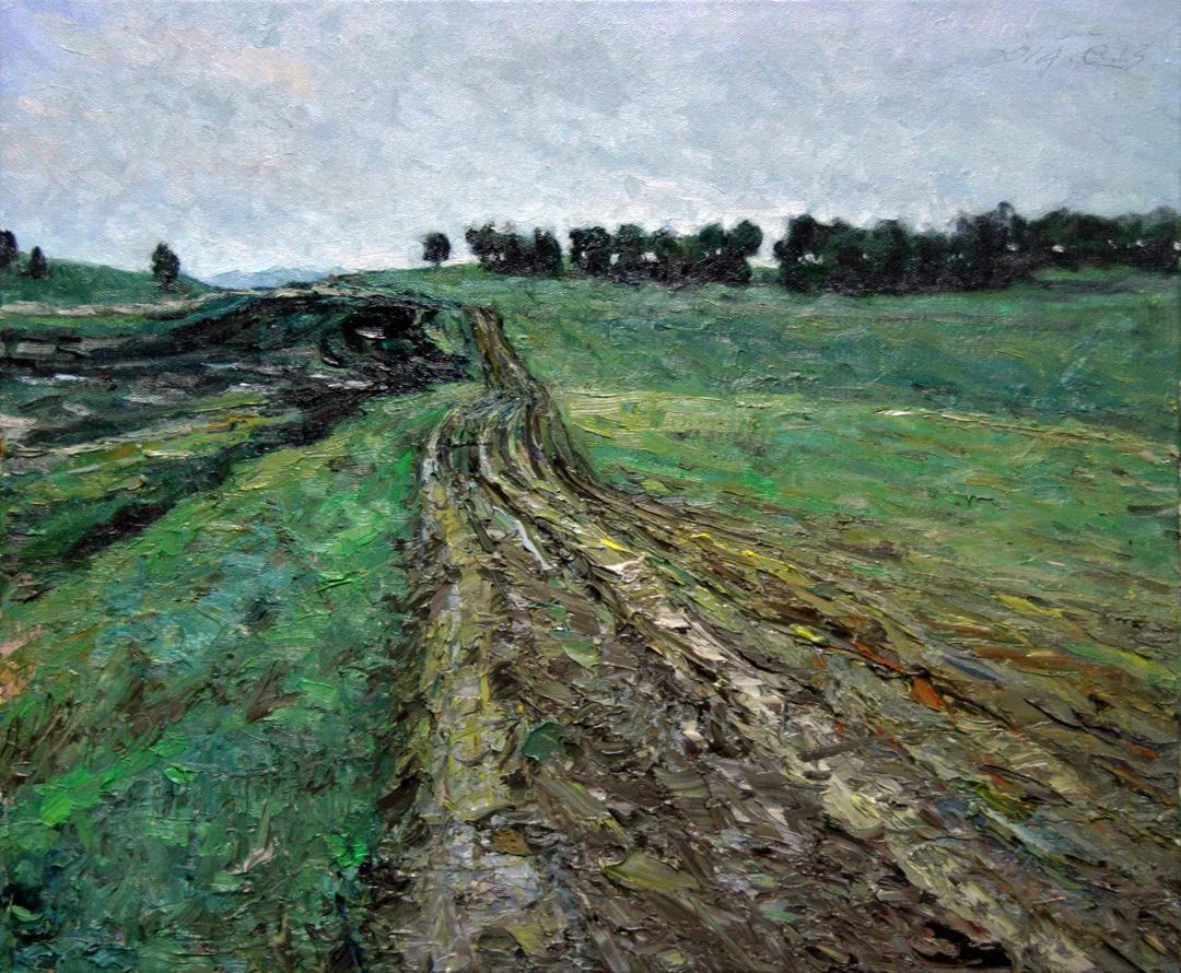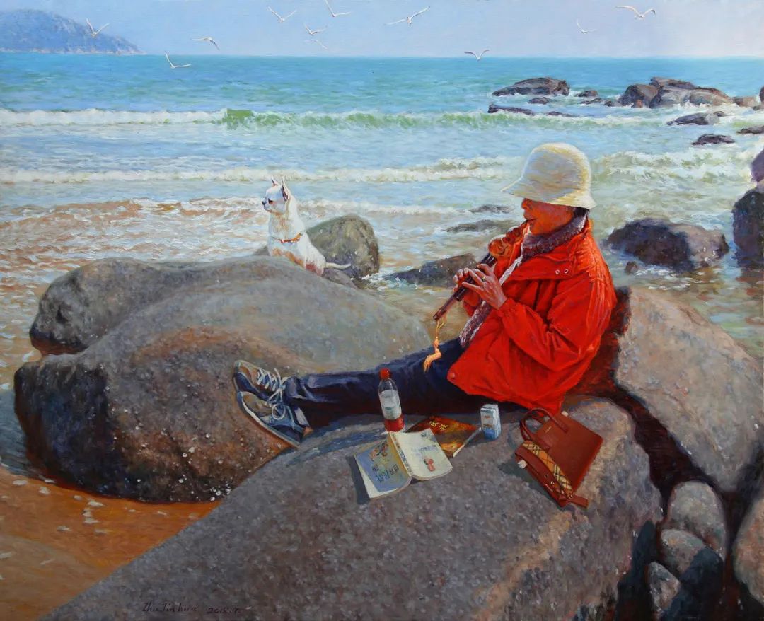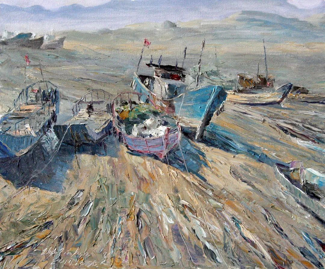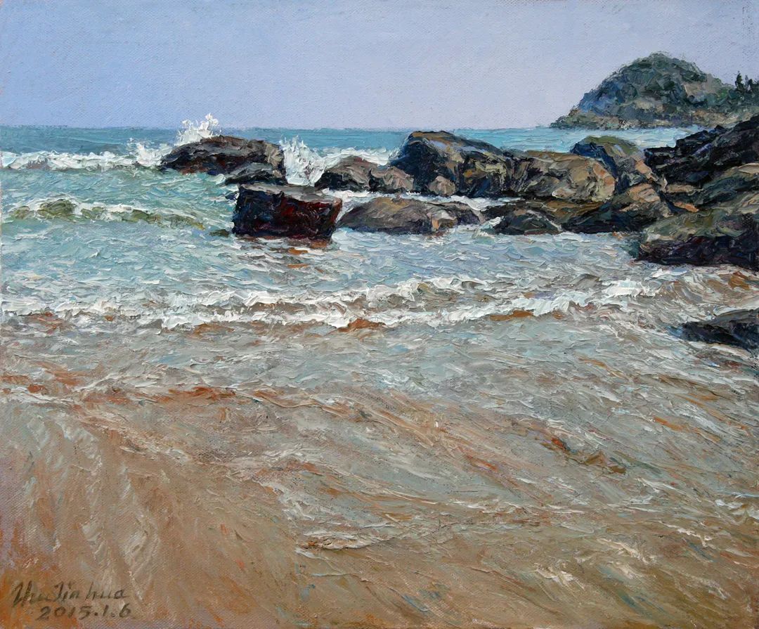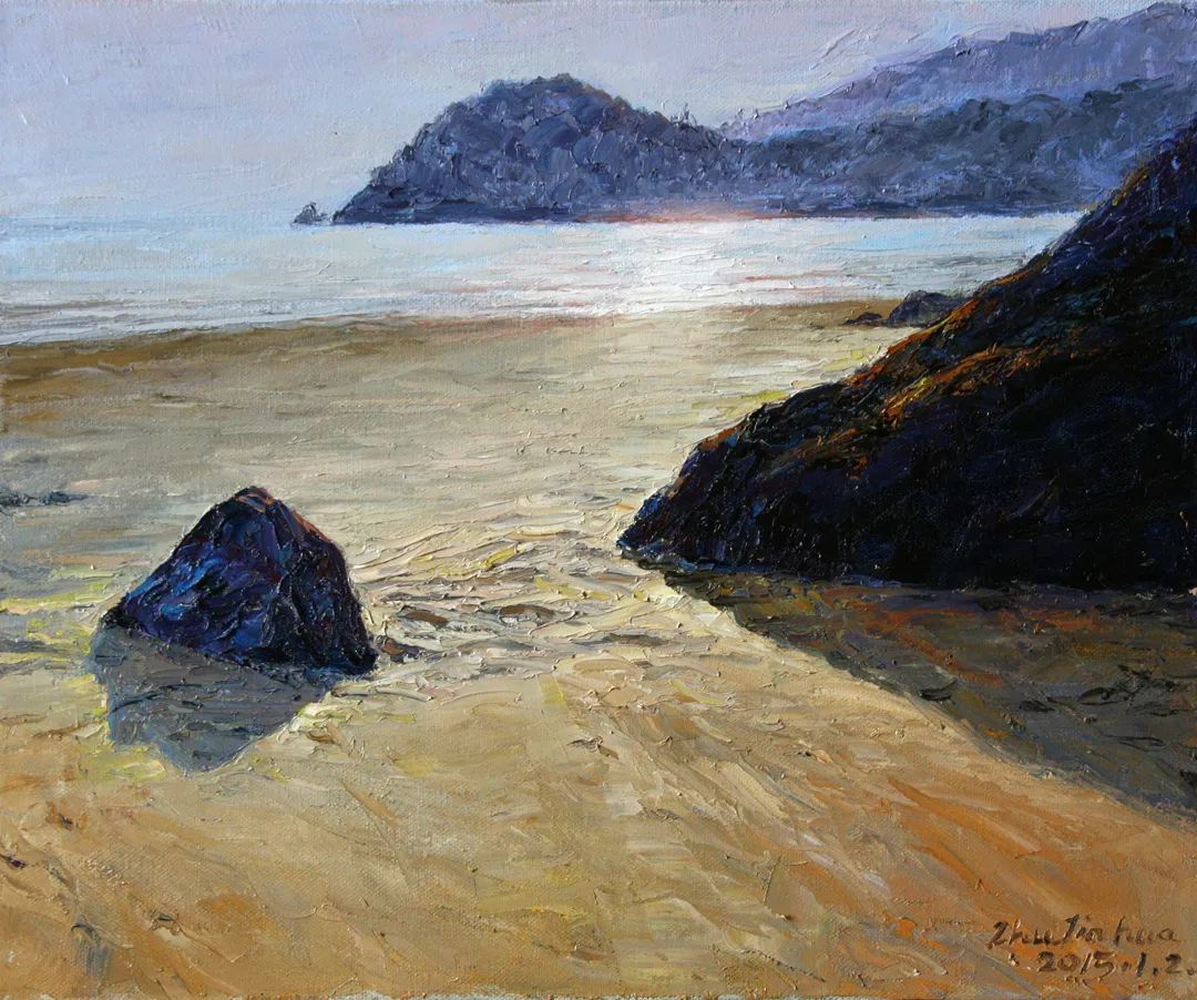 朱先生的风景画并不是一般性的完成,做颜料的堆积。他是借景生情、用色发情。他的许多风景都有深远的意境和悠悠的情愫。如《冬雨濛濛》《雨打芭蕉》《傍水依山好人家》等作品,描写的都是农村的小屋、小草和细雨,却充满了诗情画意。有的作品仅画一条农村的小道或几条船排列,如《原野的冬雨》《潮落》《潮起潮落》《大海的节奏》等,小路的弯曲、小舟的歪七歪八排列、礁石和海水的呼应,在朱先生笔下,都奏出了美妙的旋律和节奏。
