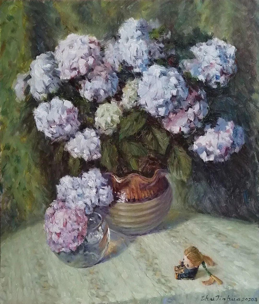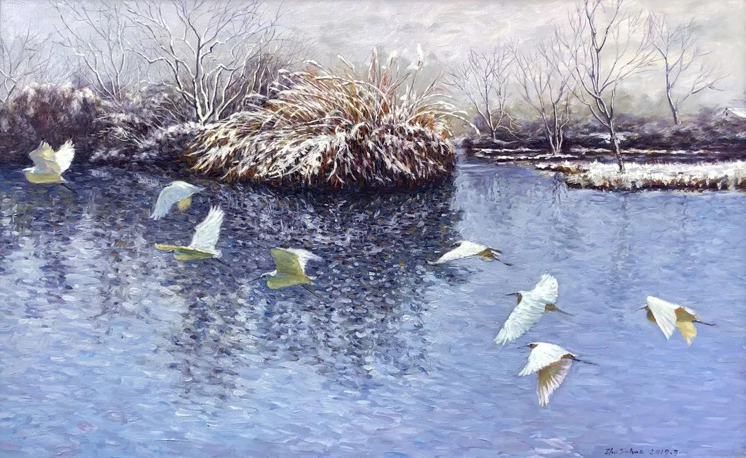 朱金华原来画国画,后来画油画,油画基本功已相当扎实,色彩的理解和运用、油画表现手段和方法也比较成熟,可以说已经是一位在社会上立足的油画家了。我跟他比较合拍,是因为心源相近,我们艺术追求的目标相通,就是“雅俗共赏”,使爱好艺术的百姓,能看得懂并喜欢。在油画布上,在“似”的基础上追求美、追求变。