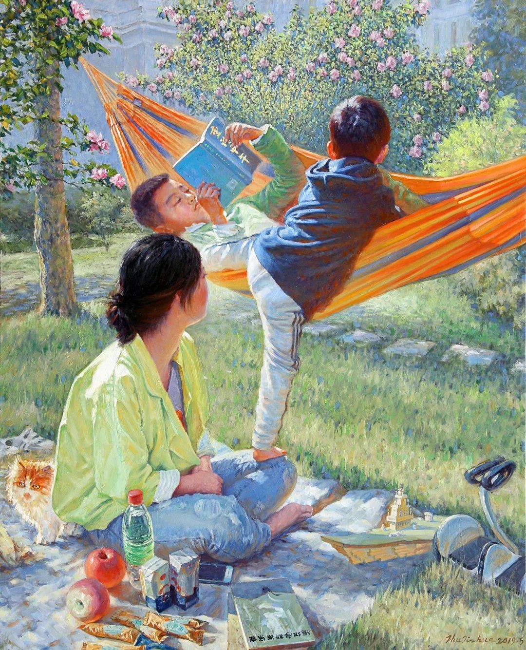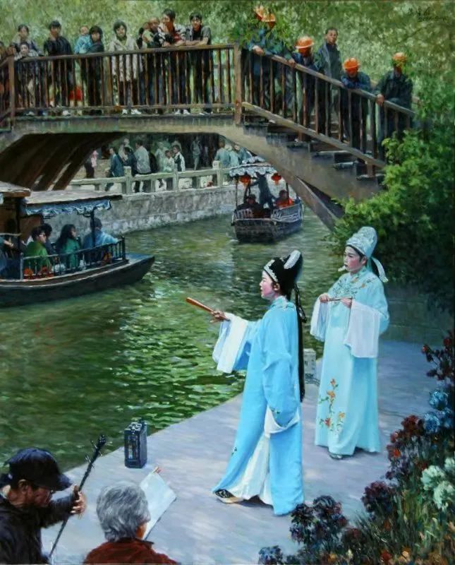 又如,江南系列之《南浔·梁祝绝唱》更是动人,前景演员的浅蓝色调跟背景黄绿色对比,使画面富有戏剧性色彩变化;木桥的曲线,又使两种色块溶为一体,使人如醉如梦。老百姓很喜欢他的画,有时在外面写生,画了一半就有人想买。