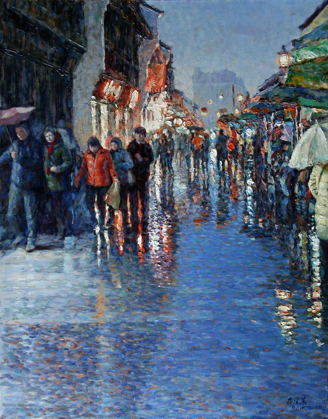 朱先生画人,没有风景那么精彩,但人物和风景结合都是既巧妙又成功。例如,江南系列之一的《杭州·河坊街雨夜》,人和景配合得十分得体,既突出了人物,也使街道并不相形见拙。从色彩上让天光和灯光并存,冷色和暖色合奏,使我们有听古典音乐那种陶醉感。