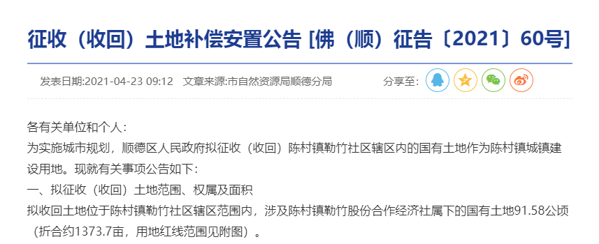 日前,乐居编辑从顺德区政府网站获悉,顺德拟收回陈村勒竹社区91.58公顷土地。