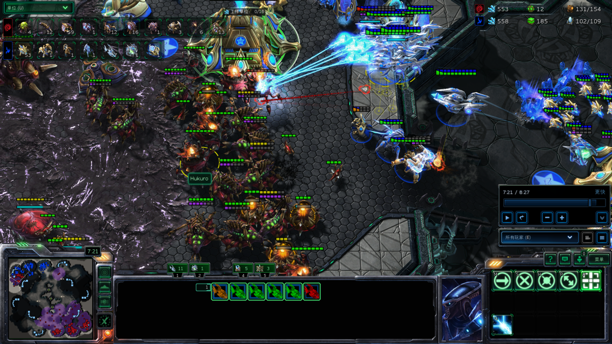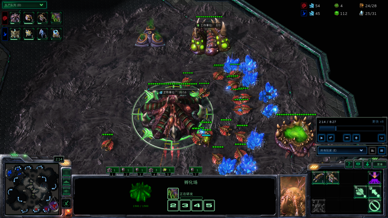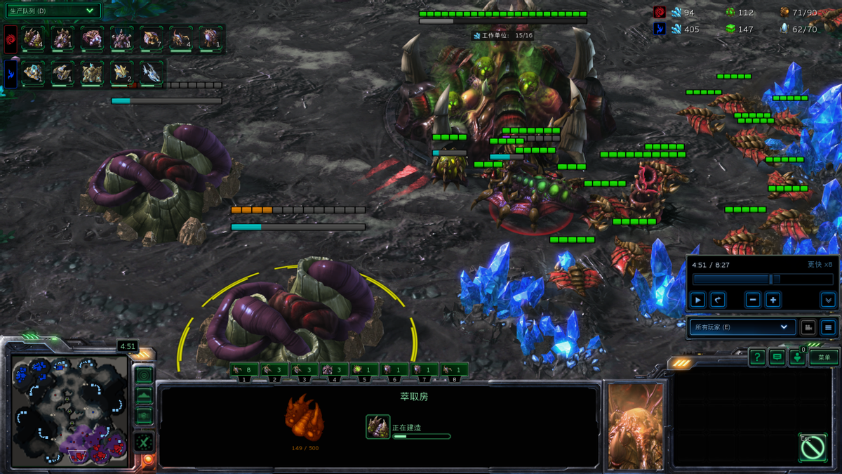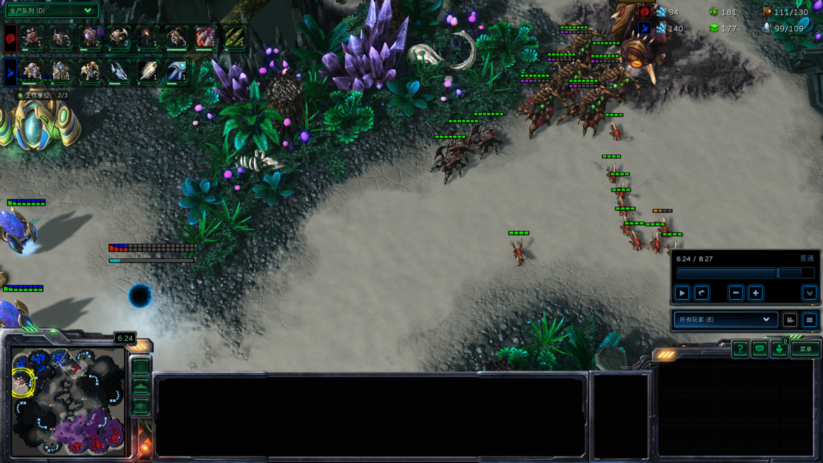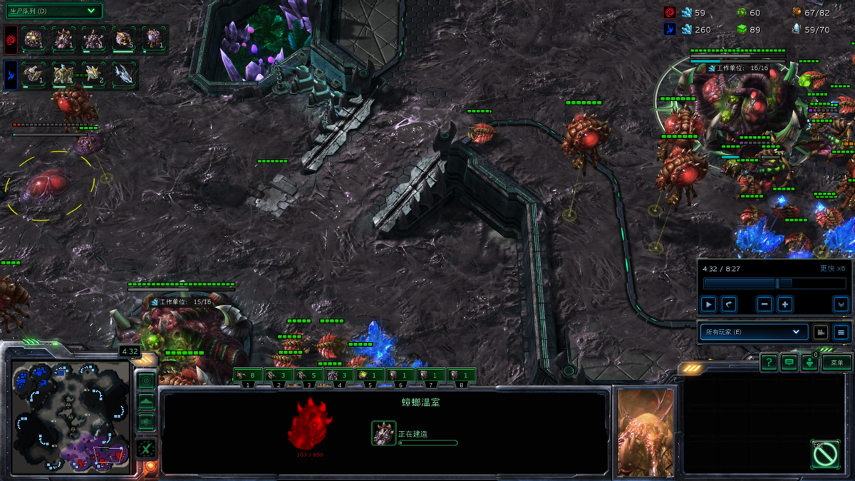 二本建造完成后,依次点下虫洞、蟑螂速度、远程一攻,同时眼虫和前线狗做好双线点虫洞的准备。虫洞应于6:00左右建造完毕,己方拥有4只蟑螂与8-10只女王。